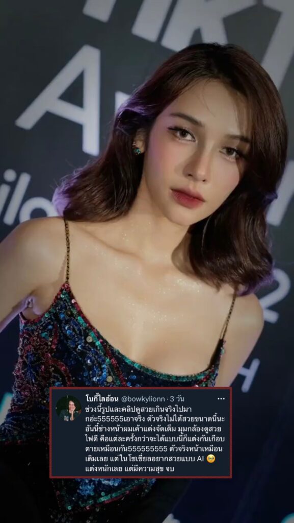 งานนี้สาว “โบกี้” ไม่รอช้าทวีตข้อความบอกเล่าที่มาของความสวยในแบบฉบับของตัวเอง ที่อ่านแล้วอดขำไม่ได้ว่า…”ช่วงนี้รูปและคลิปดูสวยเกินจริงไปมากอ่ะ555555เอาจริง ตัวจริงไม่ได้สวยขนาดนี้นะ อันนี้ช่างหน้าผมเขาแต่งจัดเต็ม มุมกล้องดูสวย ไฟดี คือแต่ละครั้งกว่าจะได้แบบนี้ก็แต่งกันเกือบตายเหมือนกัน555555555 ตัวจริงหน้าเหมือนเดิมเลย แต่ในโซเชียลอยากสวยแบบ AI แต่งหนักเลย แต่มีความสุข จบ”