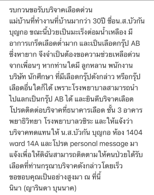 โดย ญารินดา โพสต์ข้อความผ่านอินสตาแกรมส่วนตัวว่า ” รบกวนขอรับบริจาคเลือดด่วน แม่บ้านที่ทำงานที่บ้านมากกว่า 30 ปี ชื่อน.ส บัวกัน บุญกอ ขณะนี้ป่วยเป็นมะเร็งต่อมน้ำเหลือ มีอาการเกร็ดเลือดต่ำมาก และเป็นเลือดกรุ๊ป AB ซึ่งหายาก จึงจำเป็นต้องขอความช่วยเหลือด่วน จากเพื่อน ๆ หากท่าใดมีลูกหลาน พนักงานบริษัท นักศึกษา ที่มีเลือดกรุ๊ปดังกล่าว หรือ กรุ๊ปเลือดอื่นใดก็ได เพราะโรงพยาบาลสามารถนำไปแลกเป็นกรุ๊ป AB ได้และยินดีบริจาคเลือด โปรดติดต่อบริจาคเลือที่ธนาคราเลือด ชั้น 3 อาการพยาธิวิทยา โรงพยาบาลวชิระ และให้แจ้งว่าบริจาคทดแทนให้ น.สบัวกัน บุญกอ ห้อง1404 ward14A และโปรด personal message มาแจ้งเพื่อให้ดิฉันสามารถติดตามให้คนป่วยได้รับเลือดที่ท่านกรุณาบริจาคดังกล่าวโดยเร็ว ขอขอบคุณเป็นอย่างสูงมา ณ ที่นี้ นินา (ญารินดา บุนนาค)