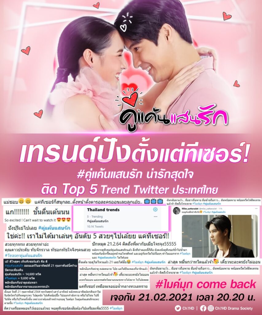 กระหึ่มโซเชียลทันที หลัง ช่อง 7HD กระตุ้นต่อมจิ้นให้ได้ฟินกันแล้ว เรียกว่าสมการรอคอยแฟน ๆ ที่ได้เห็นคู่ขวัญ ไมค์-มุก กลับมาอีกครั้ง กับตัวอย่างละคร “คู่แค้นแสนรัก” ที่แค่ปล่อยทีเซอร์แรก พร้อมเฉลยวันออกอากาศตอนแรกออกมา ก็เรียกเสียงกรี๊ดของแฟน ๆ กระแสตอบรับแรงหลังเปิดตัวไม่ทันข้ามคืน ส่งผลให้แฮชแท็ก #คู่แค้นแสนรัก ติดเทรนด์ทวิตเตอร์ประเทศไทยทันที