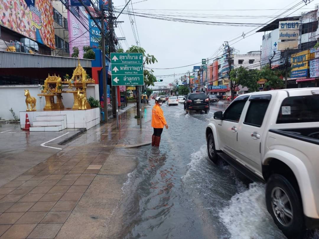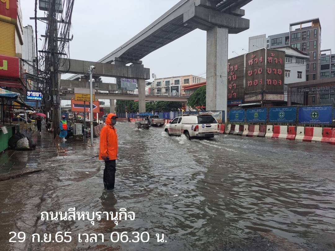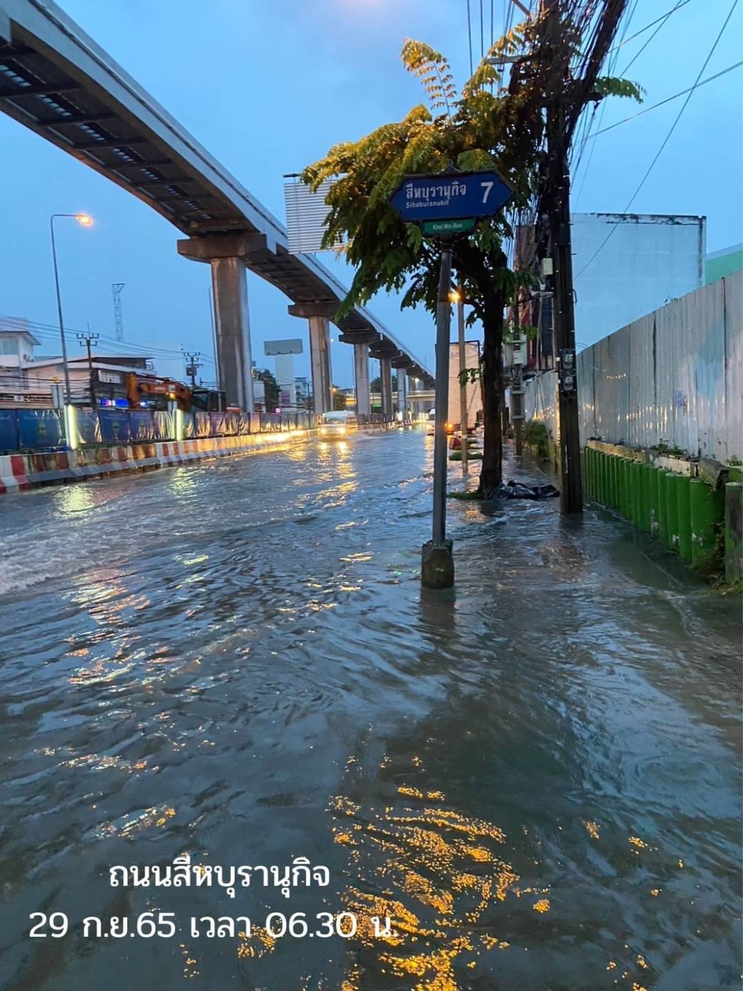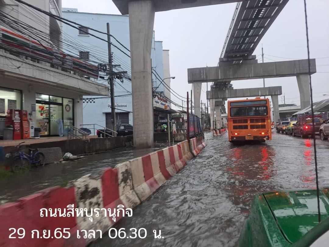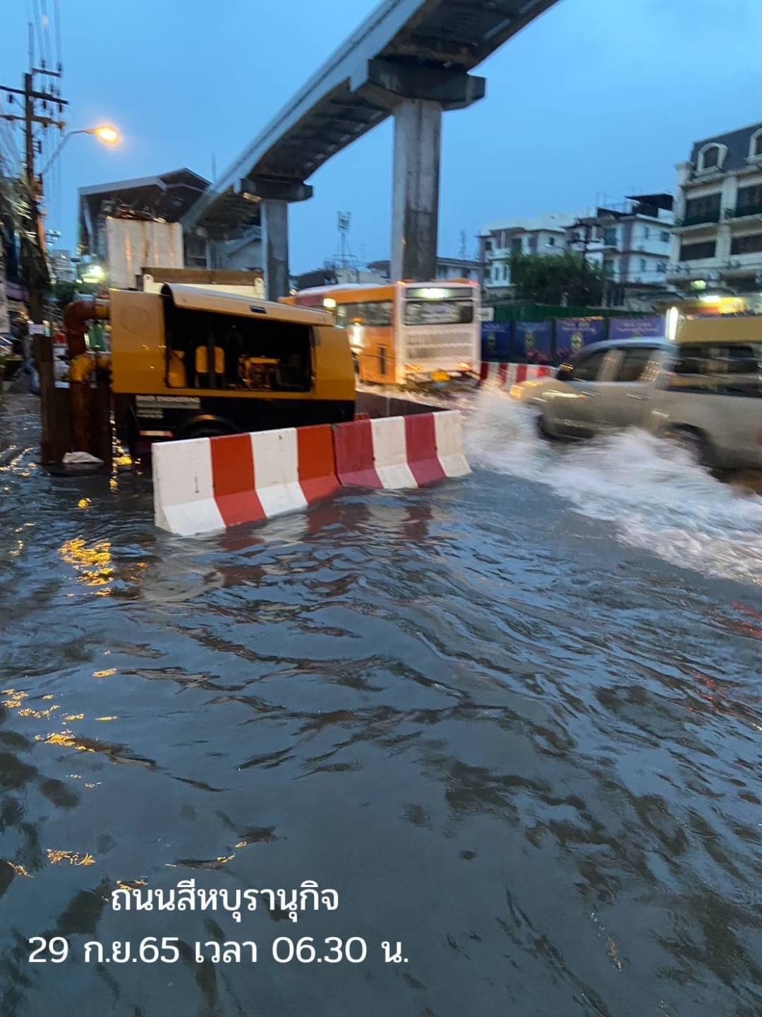 มีน้ำท่วมบริเวณถนนสีหบุรานุกิจ ตั้งแต่หน้าตลาดนัดจตุจักร 2 มีนบุรี ถึงแยกเมืองมีน (ทั้งฝั่งขาเข้าและขาออก) ระดับน้ำสูง 5-10 ซม. ระยะทางประมาณ 500 เมตร รถเล็กยังสัญจรผ่านได้ เจ้าหน้าเร่งระบายเดินเครื่องสูบน้ำเต็มกำลัง