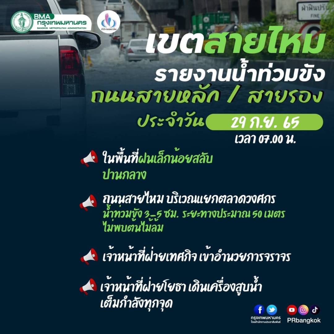 สำนักงานเขตสายไหม รายงานสถานการณ์ น้ำท่วมขัง ในพื้นที่ เขตสายไหม ประจำวันที่ 29 ก.ย.65 ณ เวลา 07.00 น. พบว่า ในพื้นที่มีฝนตกเล็กน้อยสลับปานกลาง ถนนสายไหม บริเวณแยกตลาดวงศกร น้ำท่วมขังสูง 3-5 ซม. ระยะทางประมาณ 50 เมตร ไม่พบต้นไม้ล้ม เจ้าหน้าที่ฝ่ายเทศกิจ เข้าอำนวยการจราจร ส่วน เจ้าหน้าที่ฝ่ายโยธา เดินเครื่องสูบน้ำเต็มกำลังทุกจุด (17 จุด)