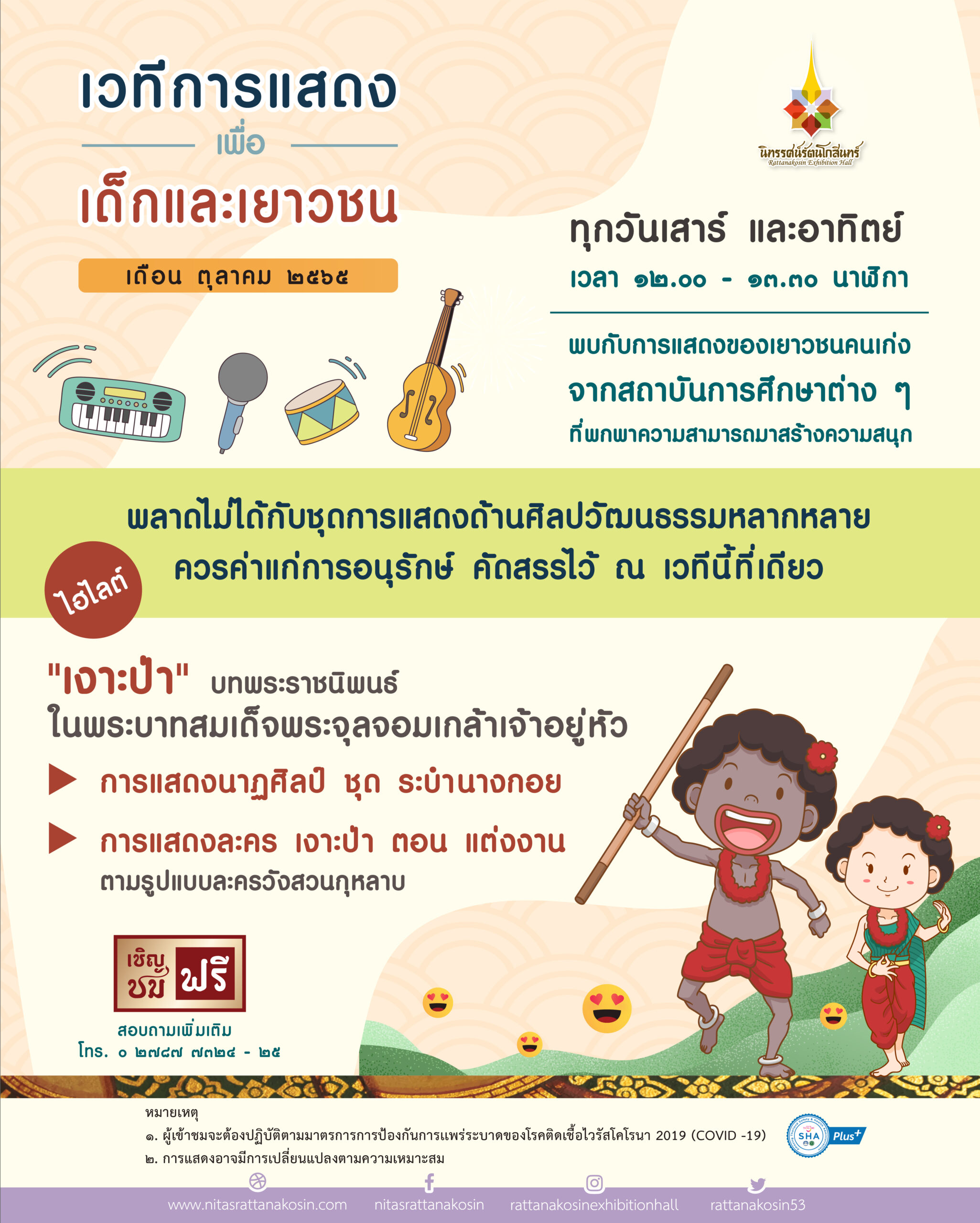 เวทีการแสดงเพื่อเด็กและเยาวชน อาคารนิทรรศน์รัตนโกสินทร์ เดือนตุลาคมนี้ พบกับ การแสดงศิลปวัฒนธรรมหลากหลาย ควรค่าแก่การอนุรักษ์ อาทิ การแสดงละคร เรื่อง “เงาะป่า” ตอน แต่งงาน ตามรูปแบบละครวังสวนกุหลาบ และการแสดงนาฏศิลป์ ชุด ระบำนางกอย จากบท พระราชนิพนธ์ในพระบาทสมเด็จพระจุลจอมเกล้าเจ้าอยู่หัว พร้อมทั้งการแสดงอื่น ๆ อีกมากมาย ชมฟรี ทุกวันเสาร์ – อาทิตย์ ระหว่างเวลา ๑๒.๐๐ – ๑๓.๓๐ นาฬิกา สอบถามเพิ่มเติม โทร. ๐ ๒๗๘๗ ๗๓๒๔ – ๒๕