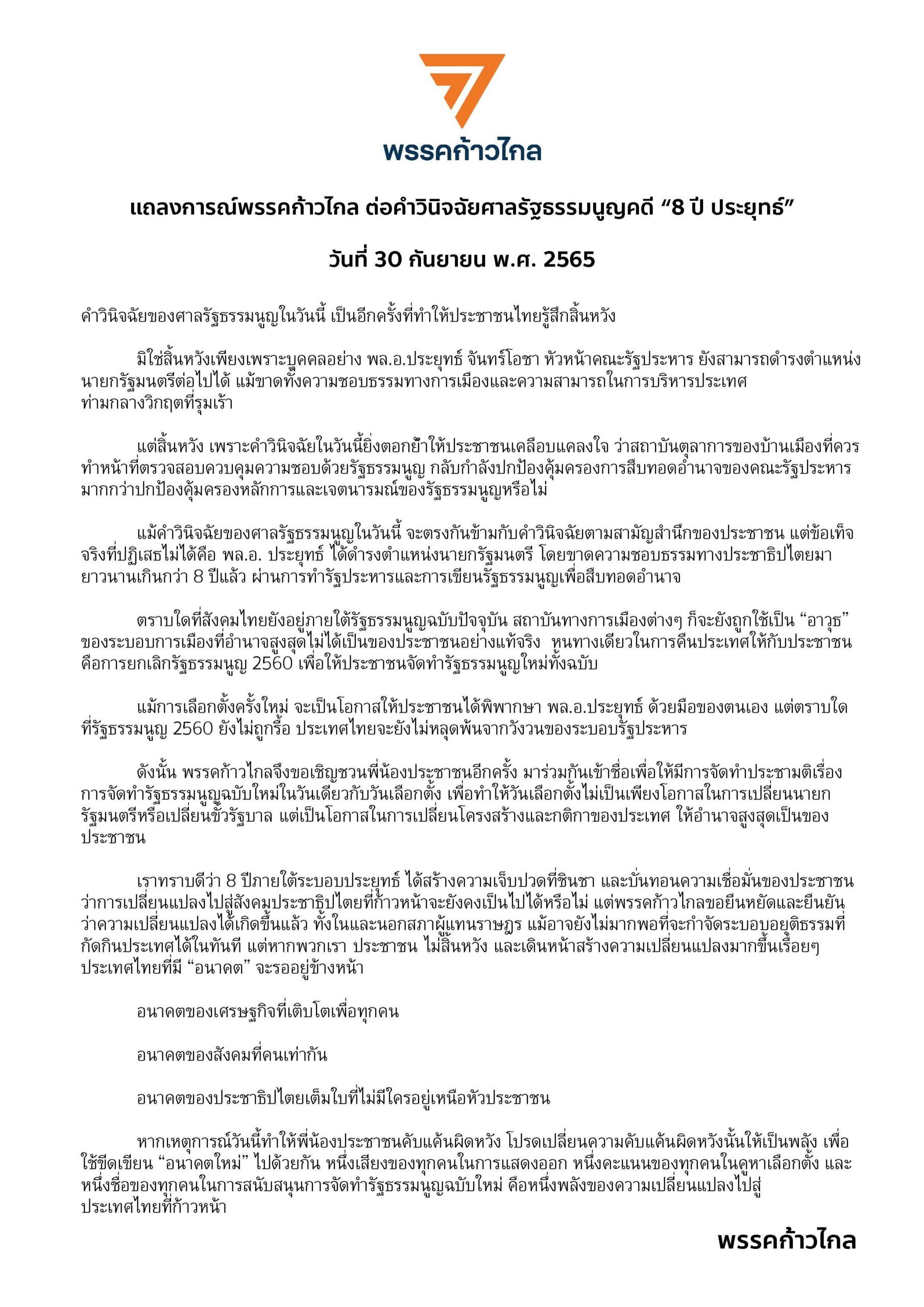 แม้คำวินิจฉัยของศาลรัฐธรรมนูญในวันนี้ จะตรงกันข้ามกับคำวินิจฉัยตามสามัญสำนึกของประชาชน แต่ข้อเท็จจริงที่ปฏิเสธไม่ได้คือ พล.อ. ประยุทธ์ ได้ดำรงตำแหน่งนายกฯ โดยขาดความชอบธรรมทางประชาธิปไตยมายาวนานเกินกว่า 8 ปีแล้ว ผ่านการทำรัฐประหารและการเขียนรัฐธรรมนูญเพื่อสืบทอดอำนาจ