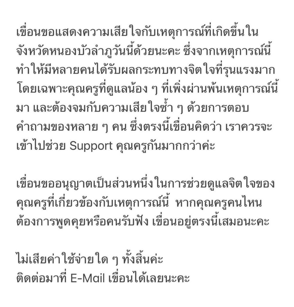เขื่อนขออนุญาตเป็นส่วนหนึ่งในการช่วยดูแลจิตใจของคุณครูที่เกี่ยวข้องกับเหตุการณ์นี้ หากคุณครูคนไหน ต้องการพูดคุยหรือคนรับฟัง เขื่อนอยู่ตรงนี้เสมอนะคะ ไม่เสียค่าใช้จ่ายใด ๆ ทั้งสิ้นค่ะ ติดต่อมาที่ E-Mail เขื่อนได้เลยนะคะ ใครที่สามารถติดต่อคุณครูได้ ฝากส่งข้อความนี้และกำลังใจไปให้ด้วยนะคะ