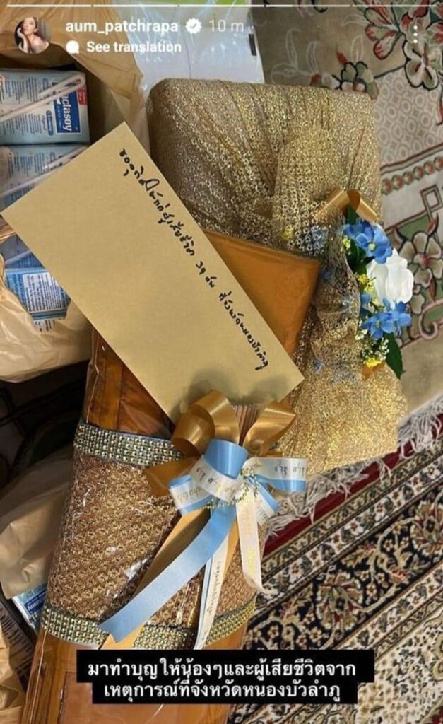 ล่าสุด นางเอกสาว อั้ม พัชราภา ไชยเชื้อ ได้โพสต์สตอรีลงในอินสตาแกรมส่วนตัวโดยได้เผยภาพ ทำบุญ พร้อมระบุุข้อความว่า มาทำบุญให้น้องๆ และผู้เสียชีวิตจากเหตุการณ์ที่จังหวัดหนองบัวลำภู