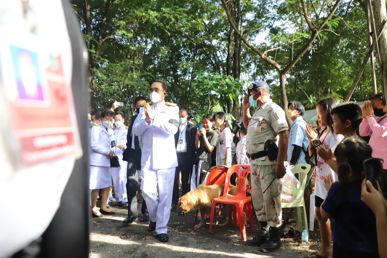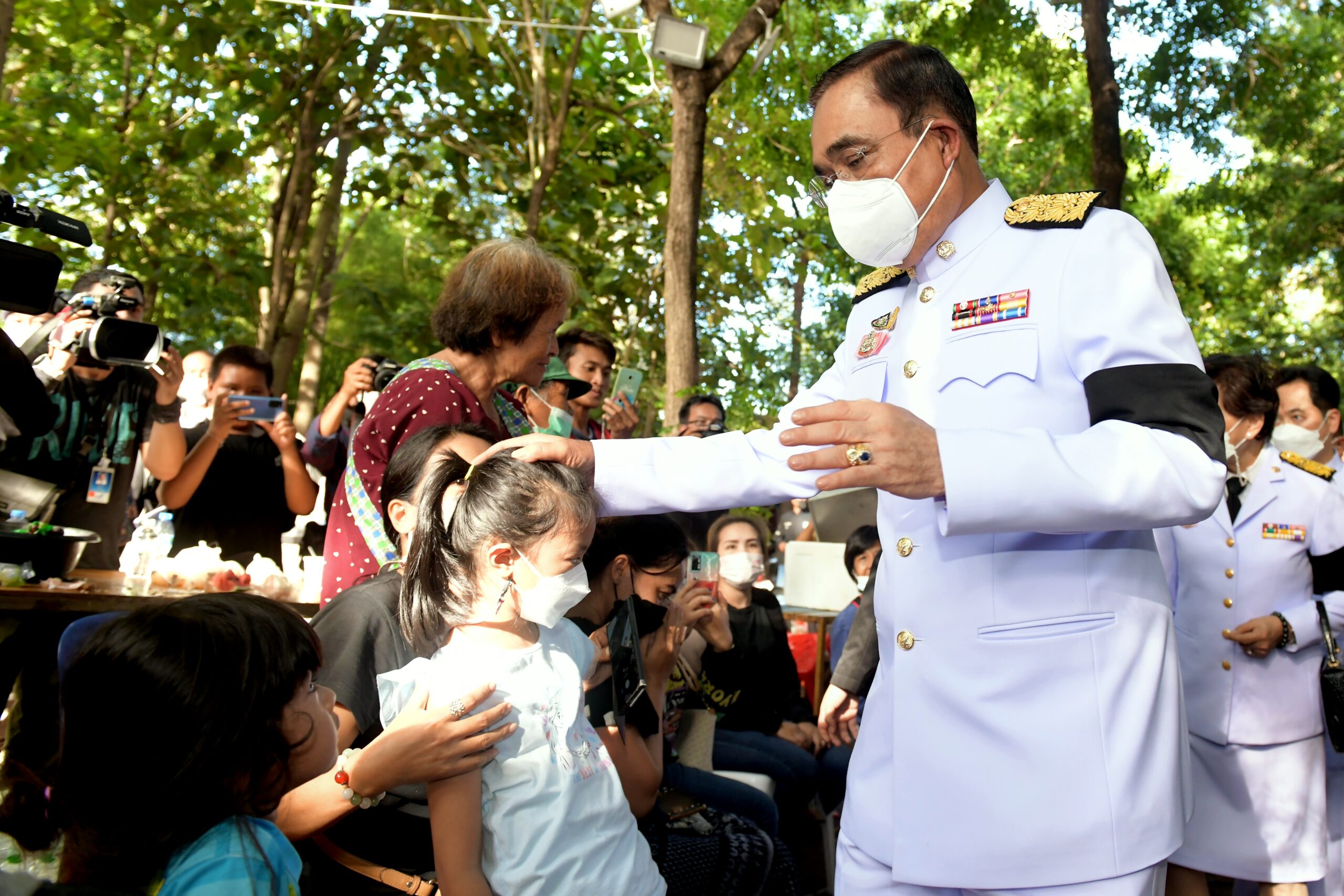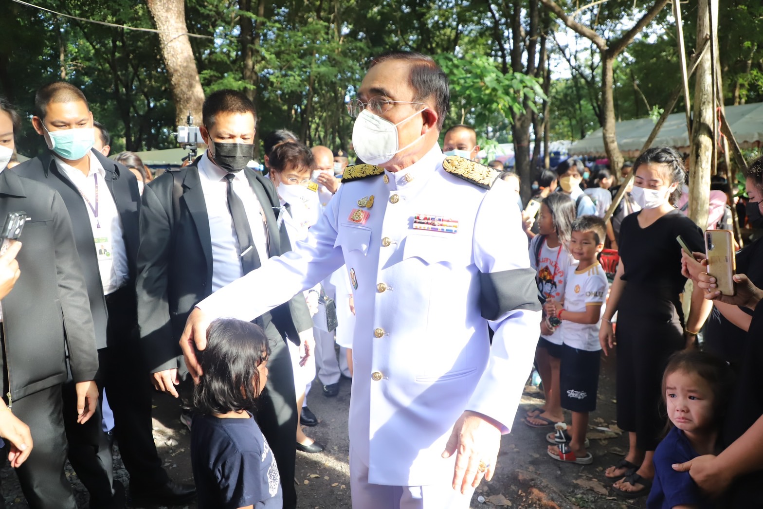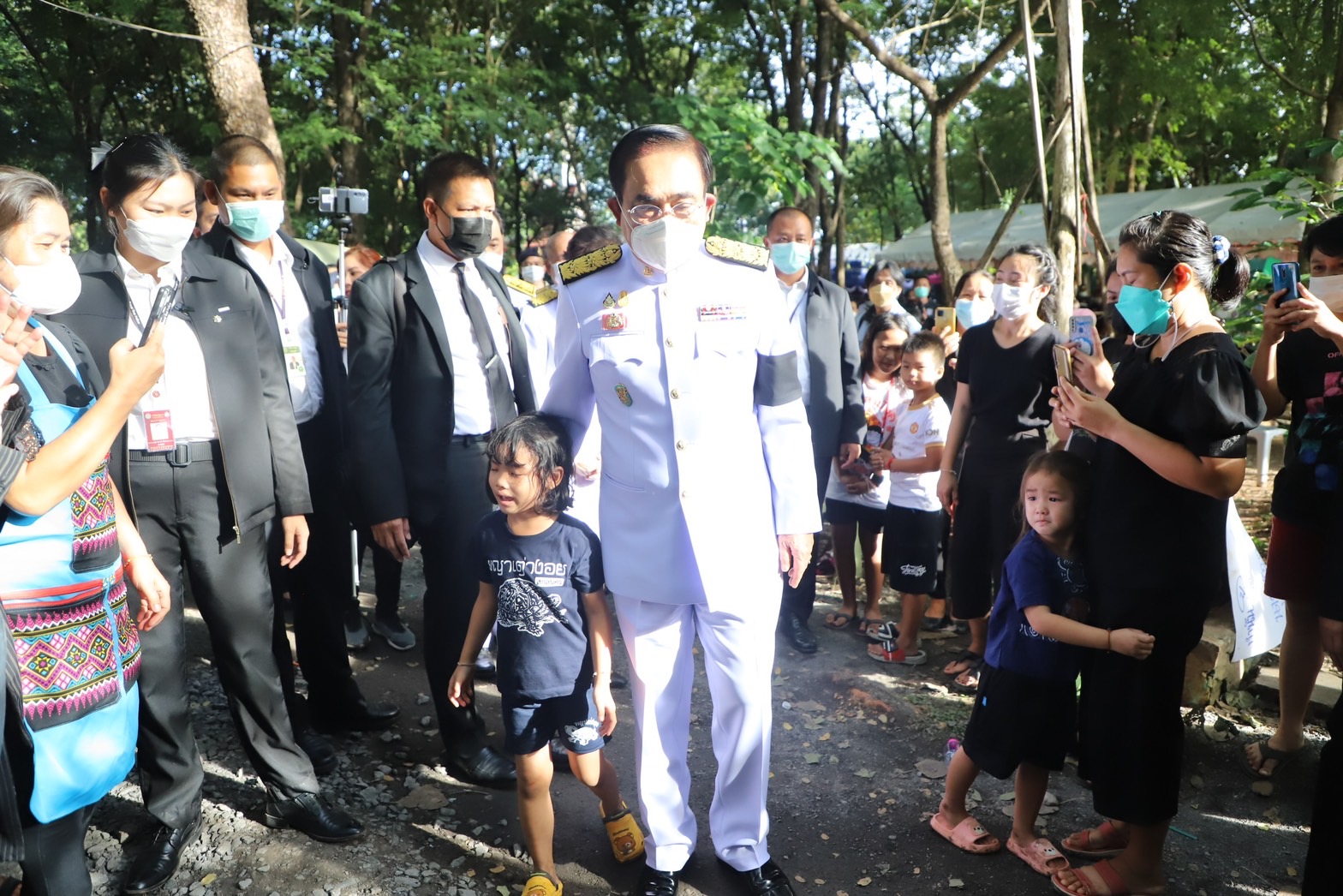 บางช่วงบางตอนนายกรัฐมนตรี ได้กล่าวว่า คนที่อยู่ก็ต้องดูแลกันรัฐบาลเองก็จะช่วยเหลือเยียวยาอย่างเต็มที่ไม่ทิ้งกันแน่นอน และเข้าไปสวมกอดเด็กๆที่อยู่ที่วัดศรีอุทัย โดยใช้เวลาที่วัดแห่งนี้ ประมาณ 20 นาที ก่อนที่จะขึ้นรถเดินทางไปต่อที่วัดราษฎร์สามัคคี