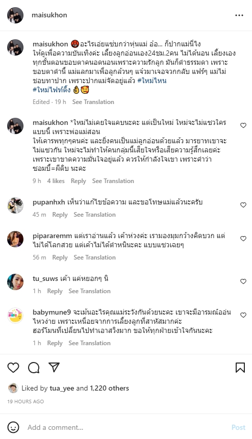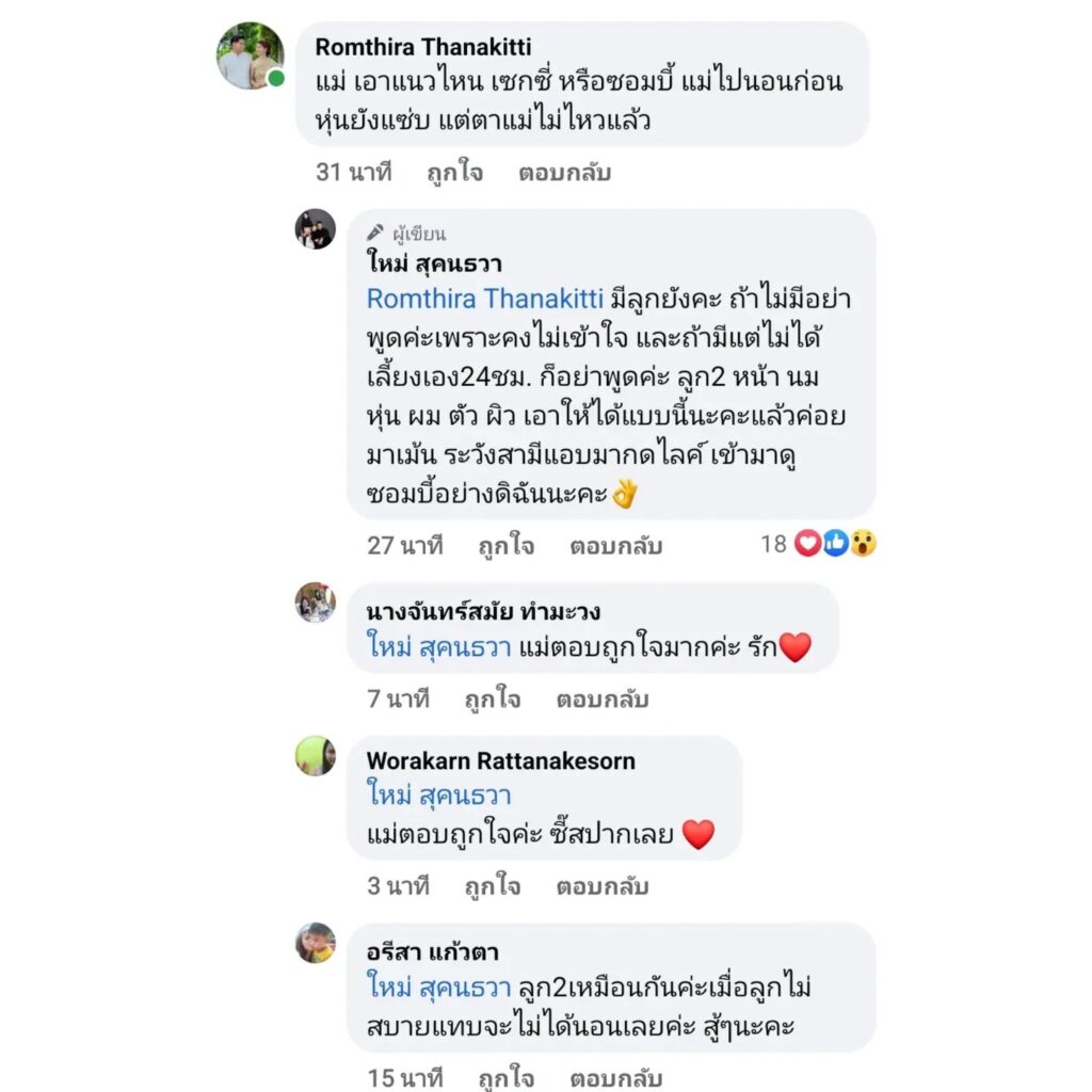 และอีกแคปชั่นว่า “อะไรเอ่ยแซ่บกว่าหุ่นแม่ อ๋อ… ก็ปากแม่นี่ไง ให้ดูเพื่อความบันเทิงค่ะ เลี้ยงลูกอ่อนเอง24ชม.2คน ไม่ได้นอน เลี้ยงเองทุกขั้นตอนขอบตาคนอดนอนเพราะความรักลูก มันก็ดำธรรมดา เพราะขอบตาดำนี้ แม่แลกมาเพื่อลูกล้วนๆ แจ๋วมาเจอจวกกลับ แฟร์ๆ แม่ไม่ชอบทาปาก เพราะปากแม่จัดอยู่แล้ว #ใหม่ไหน#ใหม่ไฟท์ติ้ง”