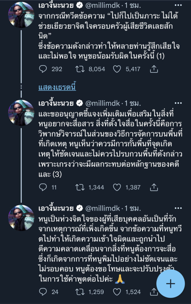 ล่าสุดมิลลิได้ทวีตข้อความขอโทษเกร่ยวกับเรื่องราวที่เกิดขึ้น พร้อมชี้แจงเหตุผลที่ต้องการจะสื่อสารว่าจากกรณีทวีตข้อความไปก็ไปเป็นภาระ ไม่ได้ช่วยเยียวยาจิตใจครอบครัวผู้เสียชีวิตเลยสักนิด