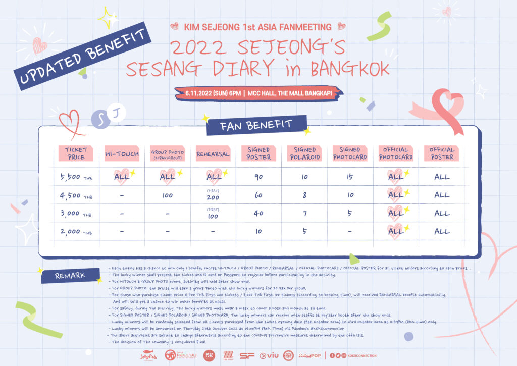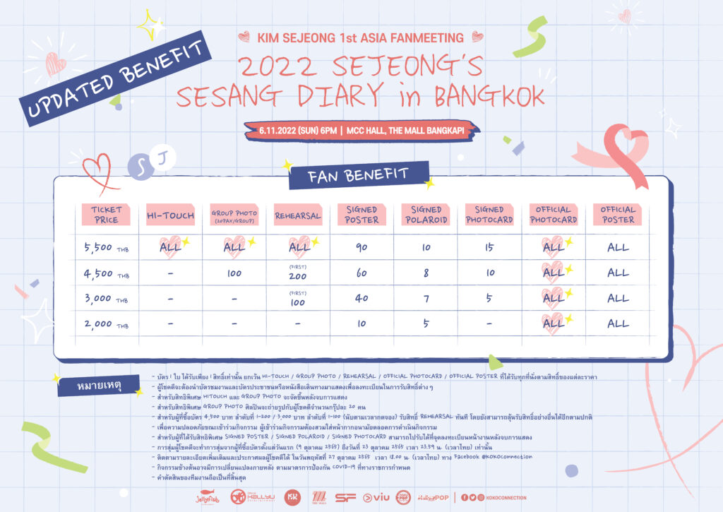 เซซังไทย ห้ามลืมนัดกับ คิมเซจอง เด็ดขาด!! เกี่ยวก้อยสัญญาแล้วมาพบกันที่งาน “2022 SEJEONG’S SESANG DIARY in BANGKOK” ในวันอาทิตย์ที่ 6 พฤศจิกายน 2565 เวลา 18.00 น. ที่ เอ็มซีซีฮอลล์ เดอะมอลล์บางกะปิ งานนี้ผู้จัด โคโค คอนเนคชั่น เตรียมเสิร์ฟความสนุก ให้คุณได้ใกล้ชิดกับสาวเซจองกันแบบฟินสุดๆ แน่นอน พร้อมเพิ่มสิทธิพิเศษแบบจัดเต็ม บัตรราคา 5,500 บาท รับสิทธิ์ HI-TOUCH, GROUP PHOTO และเข้าชมรอบซ้อมไปเลยทุกที่นั่ง!!! แถมบัตรทุกราคารับ Photo Card สุดเอ็กคลูซีฟไปเลยฟรีๆ อีกด้วย