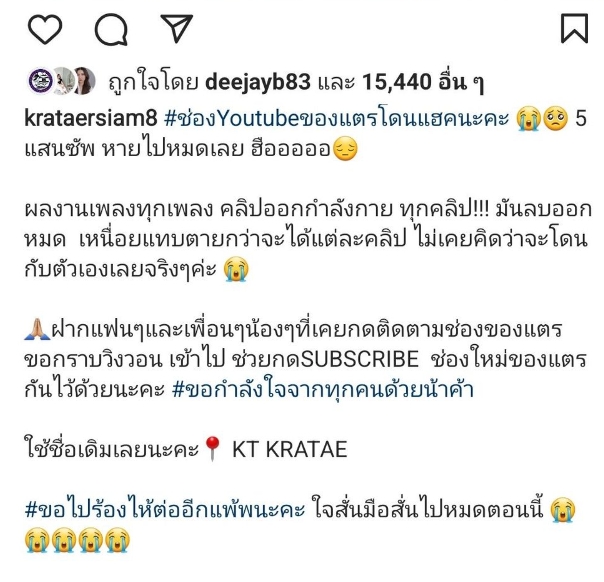 ฝากแฟนๆ และเพื่อนๆ น้องๆ ที่เคยกดติดตามช่องของแตร ขอกราบวิงวอน เข้าไป ช่วยกด SUBSCRIBE ช่องใหม่ของแตรกันไว้ด้วยนะคะ #ขอกำลังใจจากทุกคนด้วยน้าค้า ใช้ชื่อเดิมเลยนะคะ KT KRATAE #ขอไปร้องไห้ต่ออีกแพ้พนะคะ ใจสั่นมือสั่นไปหมดตอนนี้”