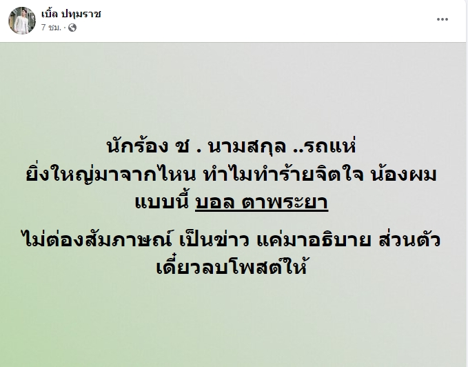 จากกรณีนักร้องลูกทุ่งชื่อดัง “เบิ้ล ปทุมราช” ได้ออกมาโพสต์ข้อความเดือด กลางเฟซบุ๊กส่วนตัว ฝากข้อความถึง นักร้อง ช. นามสกุล รถแห่ ยิ่งใหญ่มาจากไหน ทำไมทำร้ายจิตใจ น้องผมแบบนี้ พร้อมบอกให้รีบติดต่อกลับมาอธิบายเรื่องที่เกิดขึ้นด่วน งานนี้ทำเอาชาวเน็ตโยงไปถึงนักร้องหนุ่ม “โชค รถแห่”