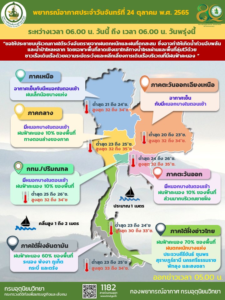 พยากรณ์อากาศ วันที่ 24 ตุลาคม 2565ลักษณะอากาศทั่วไป 24 ชั่วโมง ร่องมรสุมพาดผ่านภาคใต้ตอนกลาง ประกอบกับยังคงมีลมตะวันออกพัดปกคลุมอ่าวไทย และภาคใต้ ในขณะที่ลมตะวันตกเฉียงใต้ที่พัดปกคลุมทะเลอันดามันตอนบนมีกำลังอ่อนลง ทำให้ภาคใต้ยังคงมีฝนตกต่อเนื่อง และมีฝนตกหนักบางแห่ง ขอให้ประชาชนในบริเวณดังกล่าวระวังอันตรายจากฝนตกหนักและฝนที่ตกสะสม ซึ่งอาจทำให้เกิดน้ำท่วมฉับพลันและน้ำป่าไหลหลาก โดยเฉพาะพื้นที่ใกล้เชิงเขาและทางน้ำ รวมถึงพื้นที่ลุ่มไว้ด้วย ส่วนคลื่นลมบริเวณทะเลอันดามันและอ่าวไทยมีกำลังอ่อนลง โดยทะเลอันดามันมีคลื่นสูง 1-2 เมตร บริเวณที่มีฝนฟ้าคะนองคลื่นสูงมากกว่า 2 เมตร ส่วนอ่าวไทยมีคลื่นสูงประมาณ 1 เมตร บริเวณที่มีฝนฟ้าคะนองคลื่นสูงมากกว่า 1 เมตร ขอให้ชาวเรือเดินเรือด้วยความระมัดระวังและหลีกเลี่ยงการเดินเรือบริเวณที่มีฝนฟ้าคะนองในระยะนี้ไว้ด้วย
