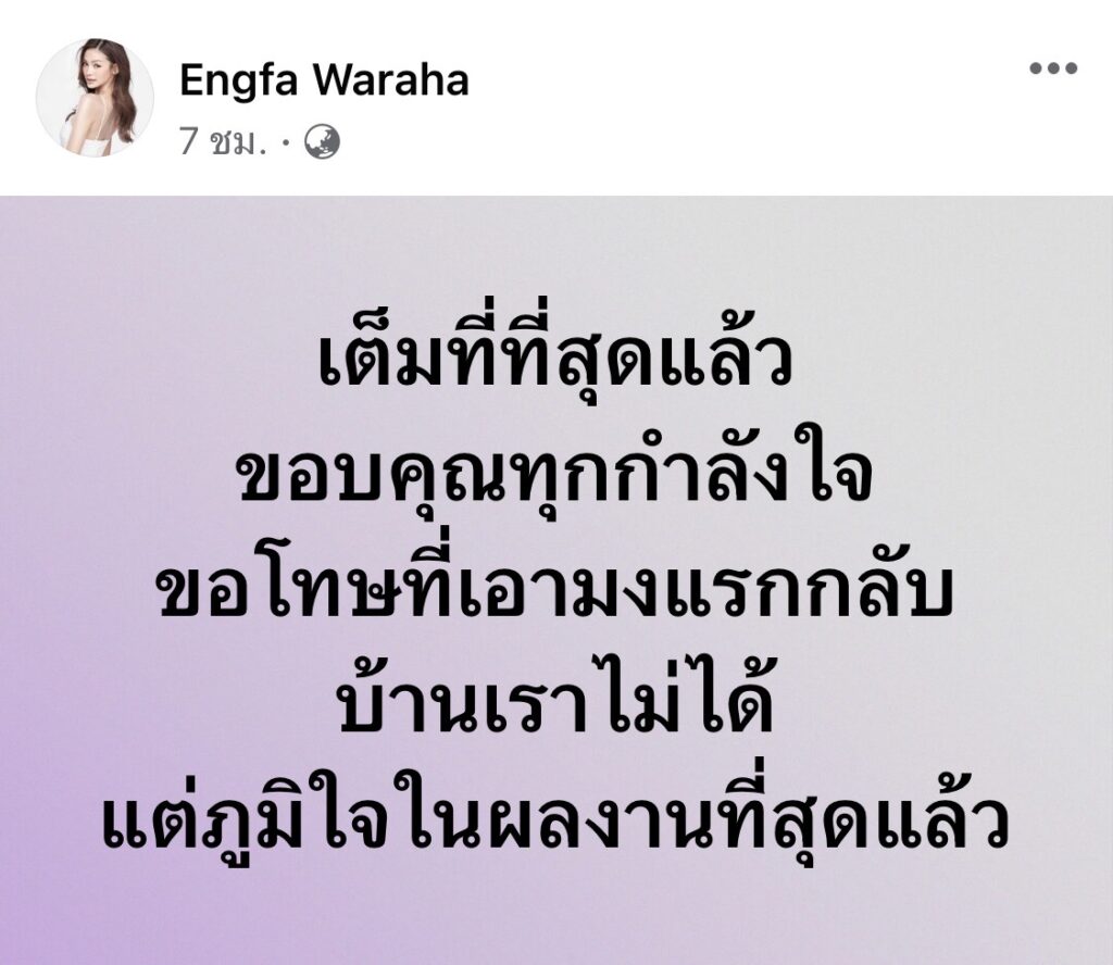 โดยภายหลังจากการเสร็จสิ้นการประกวด “อิงฟ้า” ก็ได้เคลื่อนไหว โพสต์ข้อความจากหัวใจถึงแฟนๆผ่านเฟซบุ๊คว่า “เต็มที่ที่สุดแล้ว ขอบคุณทุกกำลังใจ ขอโทษที่เอามงแรกกลับบ้านเราไม่ได้ แต่ภูมิใจในผลงานที่สุดแล้ว”