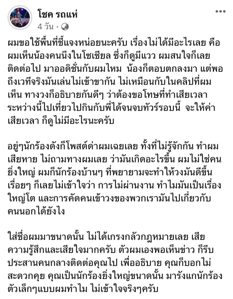 ดูท่าว่าน่าจะไม่จบลงง่ายๆแน่นอน สำหรับปมดราม่า หลังนักร้องหนุ่ม “เบิ้ล ปทุมราช” ได้โพสต์ข้อความ ถึงนักร้อง ช. นามสกุล รถแห่ ซึ่งคนโยงไปถึง “โชค รถแห่” โดยที่ไม่ได้ถามข้อเท็จจริงกับอีกฝ่ายถึงเรื่องราวที่เกิดขึ้น