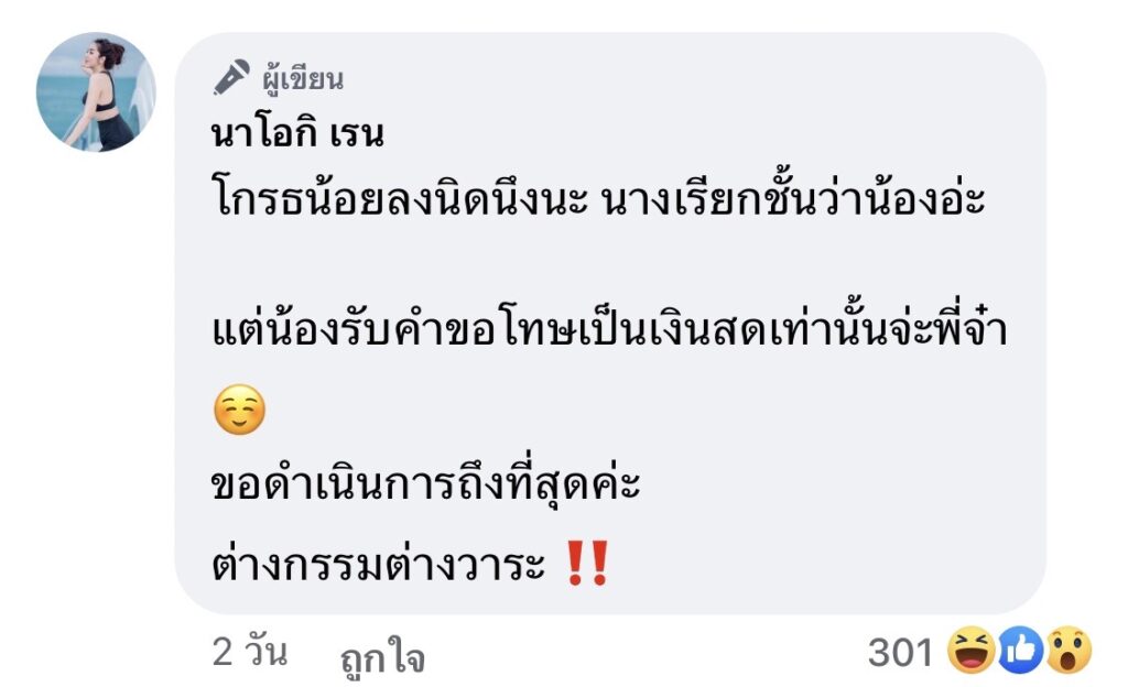 และยังโพสต์ใต้คอมเมนต์อีกว่า “ไม่เคยอยากมีศัตรู แค่อยากรู้ว่านัสผิดอะไร แค่เปนคนที่เคยมีข่าว ซึ่งความจริงเปนไงยังไม่มีใครรู้เลยด้วยซ้ำ พอมาครั้งนี้ มารุมด่ากันอีก ใช่เราปากแซ่บ เราสู้คน แต่เราไม่เคยทำร้ายใครก่อนเลยนะ เราแค่ปกป้องตัวเอง”