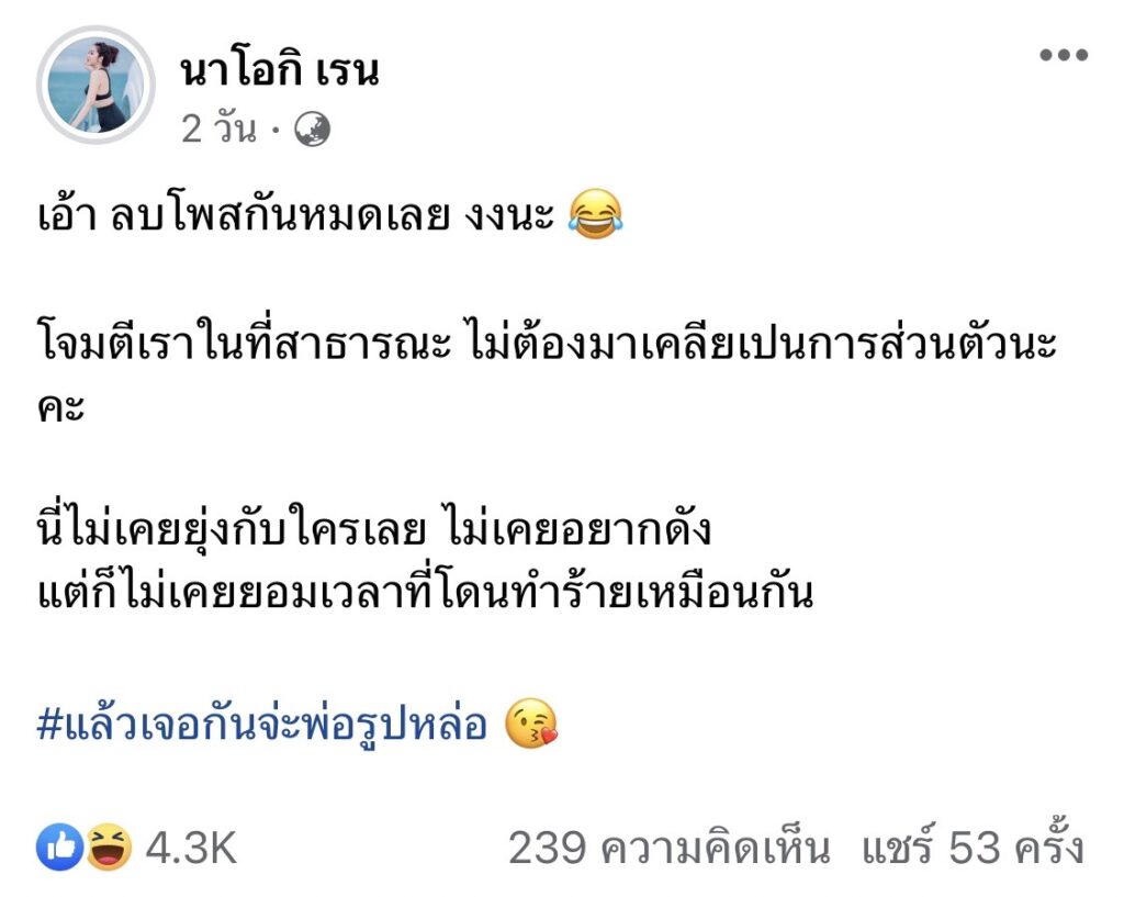 และยังโพสต์ใต้คอมเมนต์อีกว่า “ไม่เคยอยากมีศัตรู แค่อยากรู้ว่านัสผิดอะไร แค่เปนคนที่เคยมีข่าว ซึ่งความจริงเปนไงยังไม่มีใครรู้เลยด้วยซ้ำ พอมาครั้งนี้ มารุมด่ากันอีก ใช่เราปากแซ่บ เราสู้คน แต่เราไม่เคยทำร้ายใครก่อนเลยนะ เราแค่ปกป้องตัวเอง”