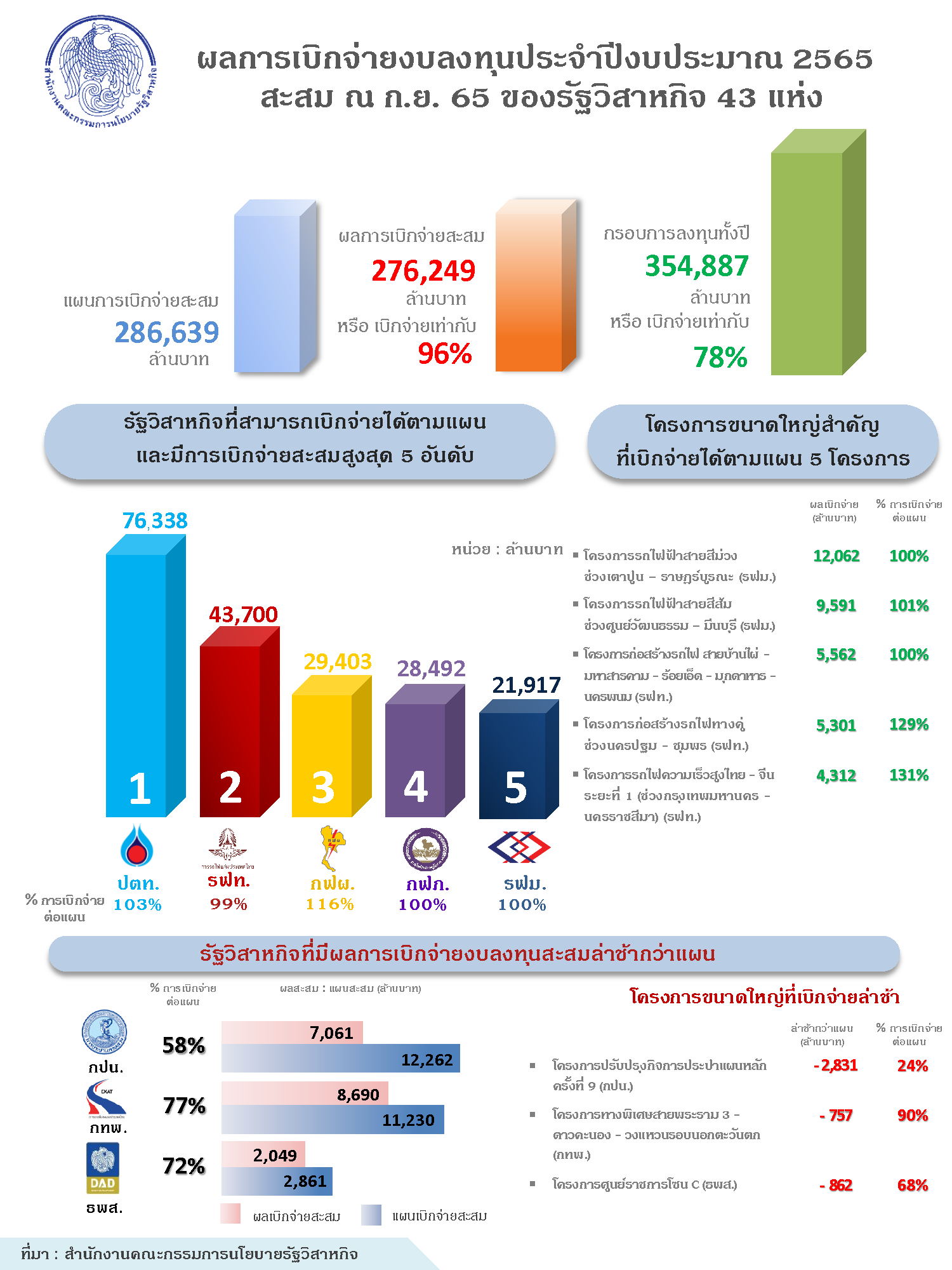 อย่างไรก็ตามปีงบประมาณ 2565 ที่ผ่านมาแม้ว่ารัฐวิสาหกิจยังคงได้รับผลกระทบสะสมจากสถานการณ์การแพร่ระบาดของโรค COVID – 19 แต่รัฐวิสาหกิจปีงบประมาณได้มีการเร่งรัดการเบิกจ่ายงบลงทุนหลังจากสถานการณ์คลี่คลายและดำเนินการตามมาตรการเร่งรัดการเบิกจ่าย ส่งผลให้มีผลการเบิกจ่ายสะสมสูงกว่าร้อยละ 88 ซึ่งสูงที่สุดในรอบ 5 ปีที่ผ่านมา