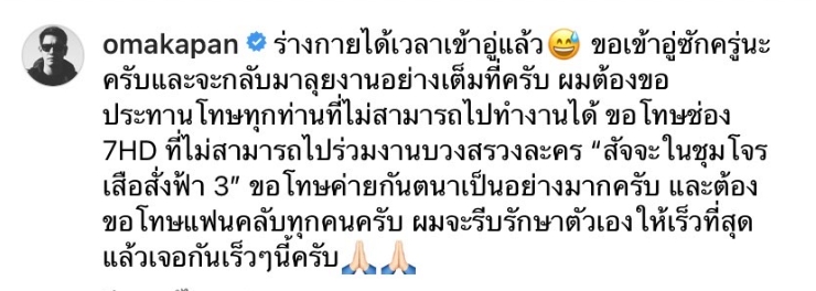“ร่างกายได้เวลาเข้าอู่แล้ว ขอเข้าอู่ซักครู่นะครับและจะกลับมาลุยงานอย่างเต็มที่ครับ ผมต้องขอประทานโทษทุกท่านที่ไม่สามารถไปทำงานได้ ขอโทษช่อง 7HD ที่ไม่สามารถไปร่วมงานบวงสรวงละคร “สัจจะในชุมโจร เสือสั่งฟ้า 3” ขอโทษค่ายกันตนาเป็นอย่างมากครับ และต้องขอโทษแฟนคลับทุกคนครับ ผมจะรีบรักษาตัวเองให้เร็วที่สุด แล้วเจอกันเร็วๆ นี้ครับ”