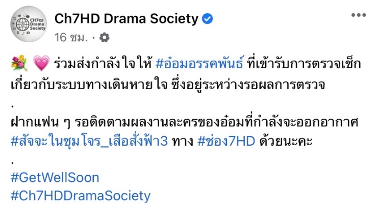 ขณะทางด้านเพจเฟซบุ๊กของทาง “Ch7HD Drama Society” ก็ได้เผยภาพของพระเอกหนุ่มขณะที่อยู่โรงพยาบาล พร้อมกับเขียนแคปชั่นแจ้งว่า… “ร่วมส่งกำลังใจให้ #อ๋อมอรรคพันธ์ ที่เข้ารับการตรวจเช็กเกี่ยวกับระบบทางเดินหายใจ ซึ่งอยู่ระหว่างรอผลการตรวจ ฝากแฟน ๆ รอติดตามผลงานละครของอ๋อมที่กำลังจะออกอากาศ #สัจจะในชุมโจร_เสือสั่งฟ้า3 ทาง #ช่อง7HD ด้วยนะคะ #GetWellSoon #Ch7HDDramaSociety”