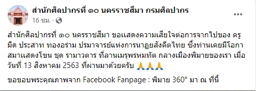 โดยเพจเฟซบุ๊ก สำนักศิลปากรที่ ๑๐ นครราชสีมา กรมศิลปากร โพสต์ข้อความอาลัยว่า สำนักศิลปากรที่ ๑๐ นครราชสีมา ขอแสดงความเสียใจต่อการจากไปของ ครูมืด ประสาท ทองอร่าม ปรมาจารย์แห่งการนาฏยสังคีตไทย ซึ่งท่านเคยมีโอกาสมาแสดงโขน ชุด รามาวตาร ที่ลานเมรุพรหมทัต กลางเมืองพิมายของเรา เมื่อวันที่ 13 สิงหาคม 2563 ที่ผ่านมา