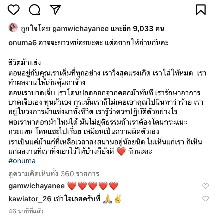 “อาจจะยาวหน่อยนะคะ แต่อยากให้อ่านกันค่ะ ชีวิตม้าแข่ง ตอนอยู่กับคุณ เราเต็มที่ทุกอย่าง เราวิ่งสุดแรงเกิด เราใส่ให้หมด เราทำผลงานให้เกินคุ้มค่าจ้าง ตอนเราบาดเจ็บ เราโดนปลดออกจากคอกม้าทันที เรารักษาอาการบาดเจ็บเอง ทุนตัวเอง กระนั้นเราก็ไม่เคยเอาคุณไปนินทาว่าร้าย เราอยู่ในวงการม้าแข่งมาทั้งชีวิต เรารู้ว่าควรปฏิบัติตัวอย่างไร พอเราหาคอกม้าใหม่ได้ มันไม่ยุติธรรมถ้าเราต้องโดนกระแนะกระแหน โดนแซะไปเรื่อย เสมือนเป็นความผิดตัวเอง เราเป็นแค่ม้าแก่ที่เหลือเวลาลงสนามอยู่น้อยนิด ไม่เห็นแก่เรา ก็เห็นแก่ผลงานที่เราทิ้งเอาไว้ให้บ้างก็ยังดี รักนะคะ”