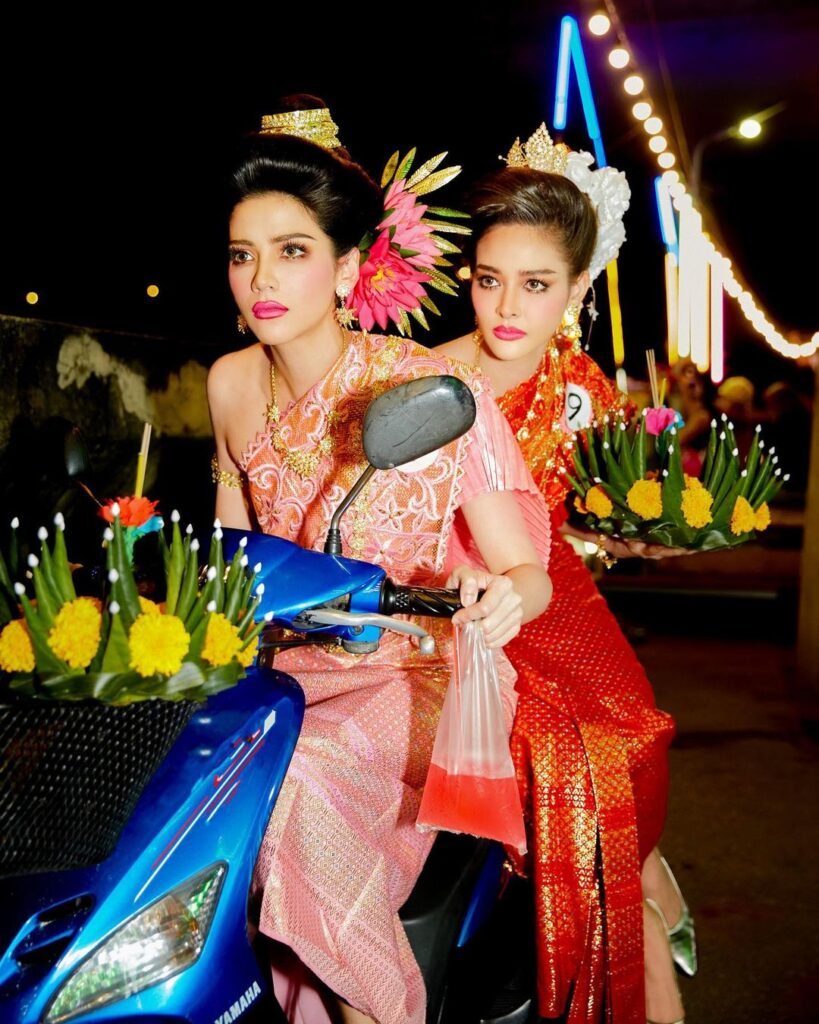 งานนี้บอกเลยว่ามาแบบเต็มคาราเบล แถมไม่ได้มาเพียงคนเดียว เพราะแท็กทีม เพื่อนซี้คนล่าสุดอย่างสาว “ปุ๊กลุก ฝนทิพย์” จัดองค์ทรงเครื่อง หน้าผม เป๊ะปัง แปลงโฉมเป็นนางนพมาศ สวยงามแบบประเพณนีไทย ซ้อนท้ายมอเตอร์ไซค์ เตรียมตัวเตรียมใจไปลอยกระทง พร้อมแปะแคปชั่นน่ารัก กวนๆ ชวนอมยิ้มว่า “ถ้าหน้าลอยแล้ว กระทงก็ไม่จำเป็น 😅 #กรรมการจะตัดสินแล้วยังไม่ถึงเวทีเลย”