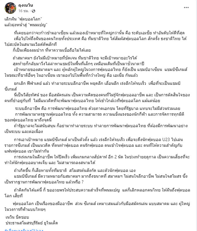 เนวิน ชิดชอบ ประธานสโมสรบุรีรัมย์ ยูไนเต็ด ออกมาโพสต์แสดงความเห็นผ่านแฟนเพจเฟซบุ๊ก “ลุงเนวิน” ถึงกรณีที่ฟุตบอลทีมชาติไทย ควรที่จะเลิกฝันที่ไปฟุตบอลโลก