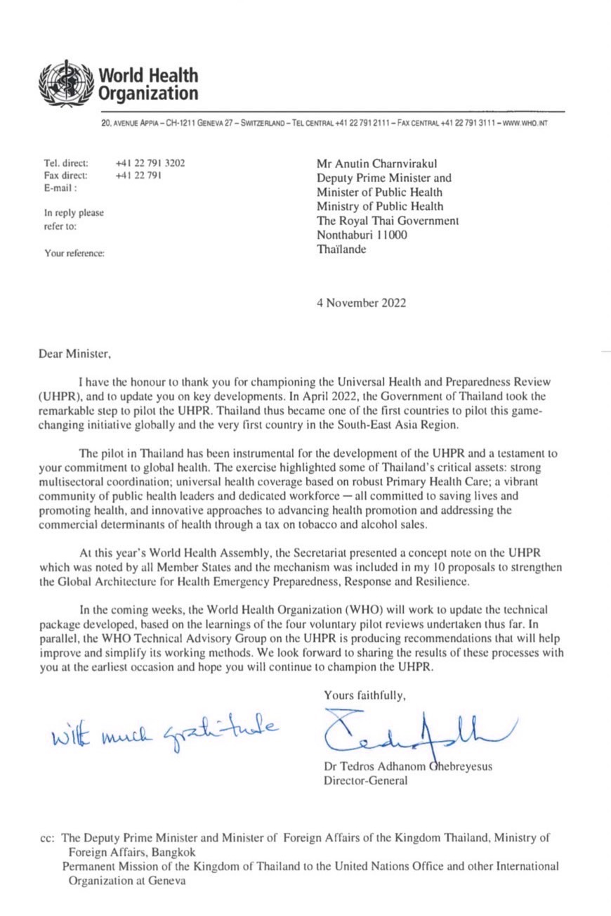 ขอบคุณประเทศไทย ในฐานะ “แชมป์เปี้ยน” ซึ่งมีการเตรียมความพร้อมด้านระบบสาธารณสุข ไปจนถึงการวางระบบดูแลสุขภาพประชาชนแบบถ้วนหน้า (Universal Health and Preparedness Review (UHPR)) ไว้อย่างยอดเยี่ยม และนับตั้งแต่เดือนเมษายน ที่ผ่านมา ประเทศไทย ได้กลายมาเป็นประเทศนำร่องด้านการวางระบบสุขภาพ ที่น่าชื่นชม นี่คือหนึ่งในประเทศแรกๆ ของโลก และเป็นประเทศแรกของอาเซียน ที่เปิดกว้างให้หน่วยงานสากลเข้ามาประเมิน เป็นจุดเริ่มต้นที่สำคัญ ในการยกระบบสาธารณสุขทั่วโลก สำหรับจุดเด่นของประเทศไทย ซึ่งเราได้รับรายงานมาจากการลงพื้นที่ตรวจสอบ ประกอบไปด้วย