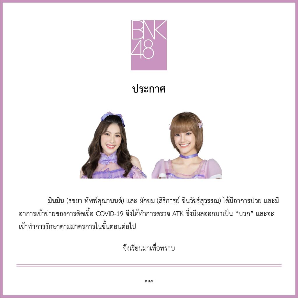 ทำเอาแฟนคลับแห่แสดงความเป็นห่วงอย่างมาก หลังต้นสังกัดออกมาประกาศว่าสองสาว “ผักขม สิริการย์ ชินวัชร์สุวรรณ” และ “มินมิน รชยา ทัพพ์คุณานนต์” สมาชิก BNK48 มีอาการติดเชื้อโควิด-19 หลังได้ทำการตรวจ ATK ซึ่งมีผลเป็นบวก ตอนนี้เข้าทำการรักษาตัวตามมาตรการแล้ว