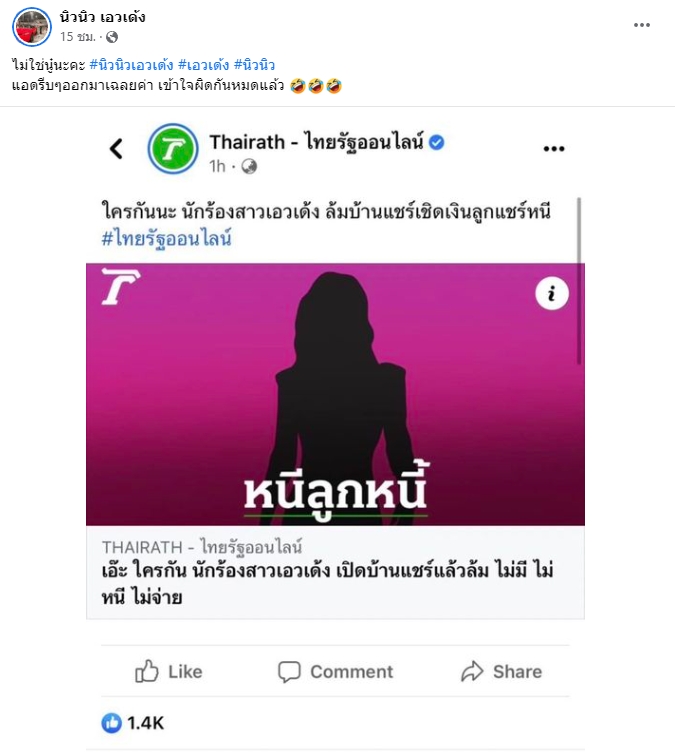 ถูกเข้าใจผิด! “นิวนิว เอวเด้ง” โร่เคลียร์ไม่ใช่ นักร้องสาวเอวเด้ง ล้มบ้านแชร์