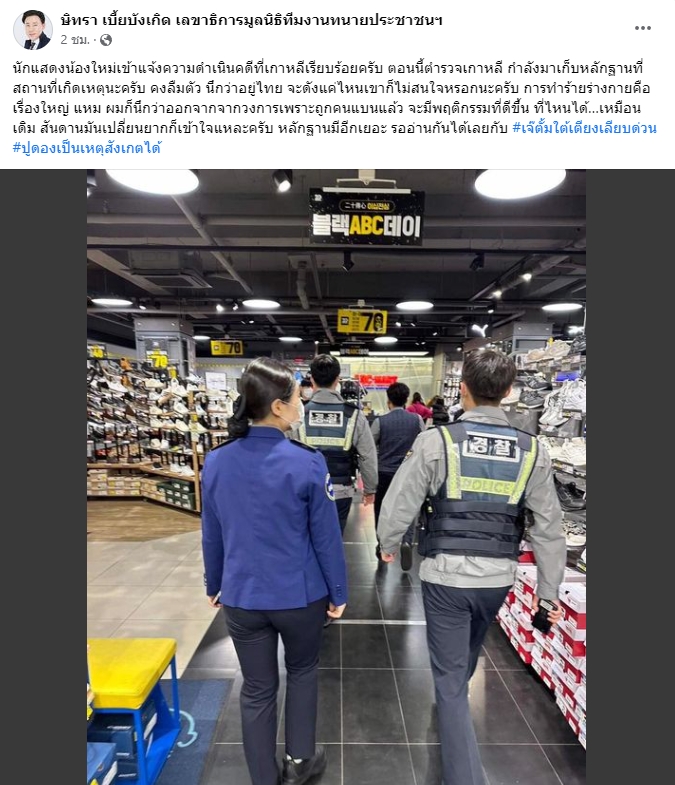 “นักแสดงน้องใหม่เข้าแจ้งความดำเนินคดีที่เกาหลีเรียบร้อยครับ ตอนนี้ตำรวจเกาหลี กำลังมาเก็บหลักฐานที่สถานที่เกิดเหตุนะครับ คงลืมตัว นึกว่าอยู่ไทย จะดังแค่ไหนเขาก็ไม่สนใจหรอกนะครับ การทำร้ายร่างกายคือเรื่องใหญ่ แหม ผมก็นึกว่าออกจากวงการเพราะถูกคนแบนแล้ว จะมีพฤติกรรมที่ดีขึ้น ที่ไหนได้…เหมือนเดิม สันดานมันเปลี่ยนยากก็เข้าใจแหละครับ หลักฐานมีอีกเยอะ รออ่านกันได้เลยกับ #เจ๊ตั้มใต้เตียงเลียบด่วน #ปูดองเป็นเหตุสังเกตได้”