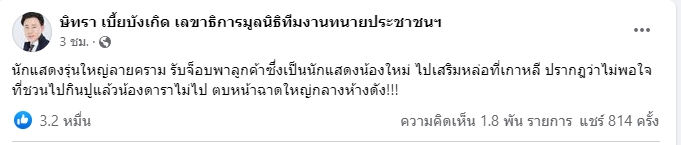 นักแสดงรุ่นใหญ่ลายคราม รับจ็อบพาลูกค้าซึ่งเป็นนักแสดงน้องใหม่ช่องน้อยสี ไปเสริมหล่อที่เกาหลี ปรากฎว่าไม่พอใจที่ชวนไปกินปูแล้วน้องดาราไม่ไป ตบหน้าฉาดใหญ่กลางห้างดัง!!! โดยดาราช่องน้อยสีได้แจ้งความเอาผิดดารารุ่นใหญ่แล้ว