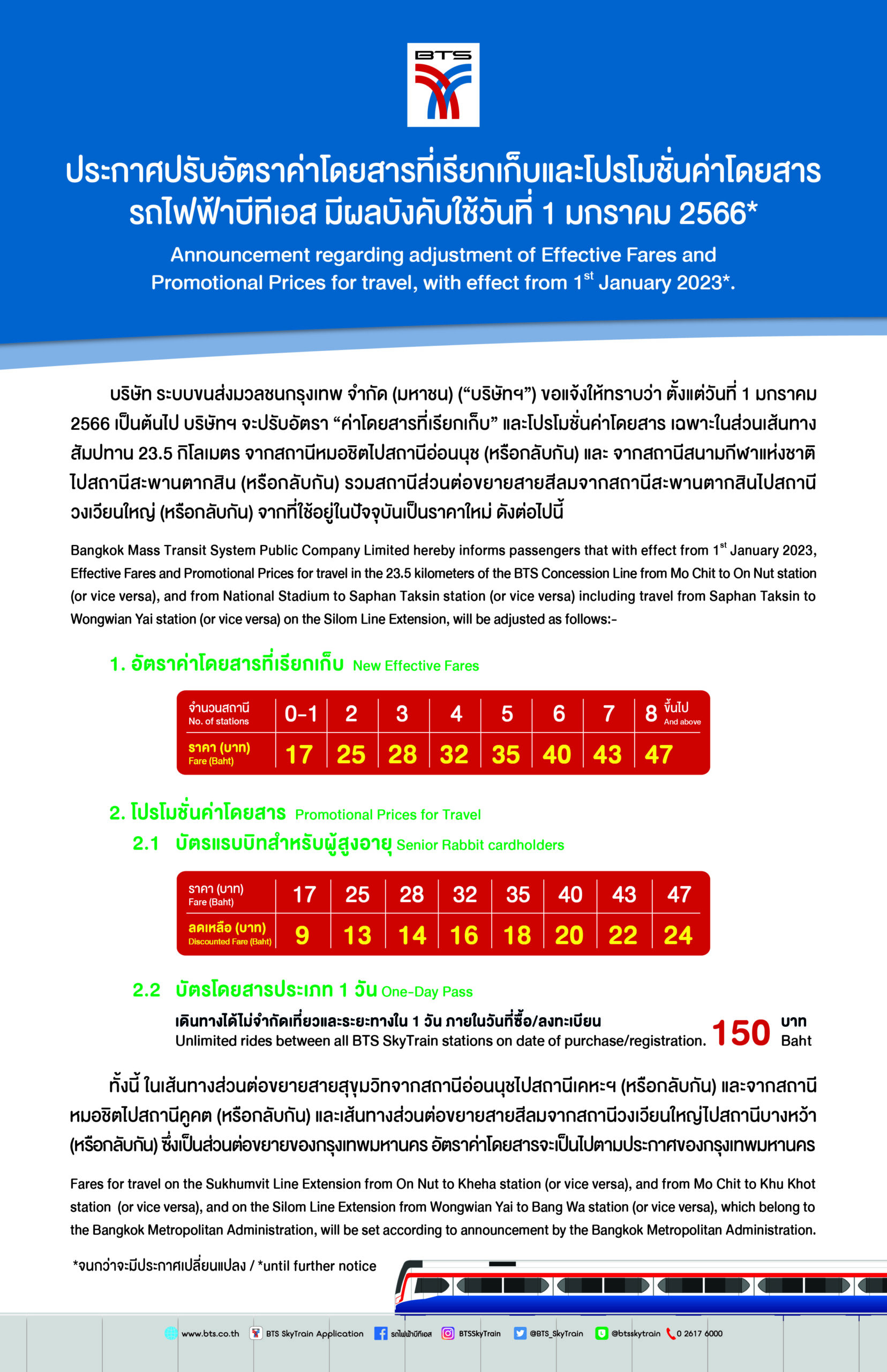 นายสุรพงษ์ เลาหะอัญญา กรรมการผู้อำนวยการใหญ่ บริษัท ระบบขนส่งมวลชนกรุงเทพ จำกัด (มหาชน) เปิดเผยว่า ตั้งแต่วันที่ 1 มกราคม 2566 บริษัทฯ จะปรับราคาค่าโดยสารที่เรียกเก็บสำหรับรถไฟฟ้าบีทีเอสในเส้นทางสัมปทานระยะทาง 23.5 กิโลเมตร 24 สถานี ได้แก่ สายสุขุมวิท สถานีหมอชิต -สถานีอ่อนนุช และสายสีลม สถานีสนามกีฬาแห่งชาติ – สถานีสะพานตากสิน รวมถึงส่วนต่อขยายสายสีลม สถานีกรุงธนบุรี และสถานีวงเวียนใหญ่ จากราคา 16 – 44 บาท ปรับเป็น 17 – 47 บาท ทั้งนี้ การปรับราคา ค่าโดยสารใหม่นั้น ยังต่ำกว่าเพดานอัตราค่าโดยสารสูงสุดตามสัญญาสัมปทานซึ่งอยู่ในอัตรา 21.52 – 64.53 บาท