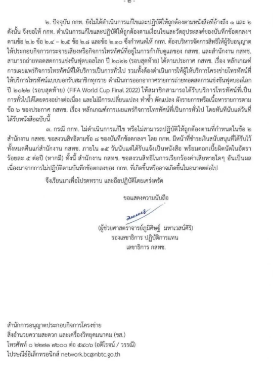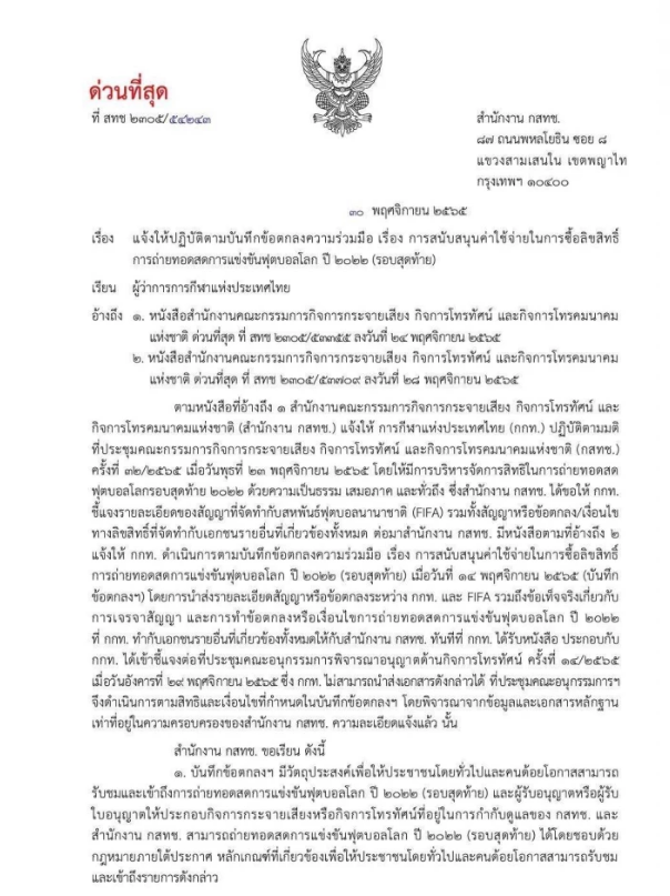 กสทช. ส่งหนังสือไปถึงผู้ว่าการ การกีฬาแห่งประเทศไทย เรื่องการปฏิบัติตามบันทึกข้อตกลงความร่วมมือ เรื่อง การสนับสนุนค่าใช้จ่ายในการซื้อลิขสิทธิ์ การถ่ายทอดสดการแข่งขันฟุตบอลโลก ปี 2022 (รอบสุดท้าย)