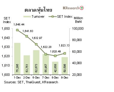 ส่วนความเคลื่อนไหวของตลาดหุ้นไทยสัปดาห์หน้า บริษัทหลักทรัพย์กสิกรไทย จำกัด ประเมินว่า ดัชนีมีแนวรับที่ 1,610 และ 1,600 จุด แนวต้านอยู่ที่ 1,640 และ 1,650 จุด ตามลำดับ โดยปัจจัยสำคัญที่ต้องติดตาม ได้แก่ การประชุมเฟด (13-14 ธ.ค.) มาตรการของขวัญปีใหม่จากรัฐบาล รวมถึงทิศทางเงินทุนต่างชาติ และข้อมูลเศรษฐกิจสหรัฐฯ ที่สำคัญ
