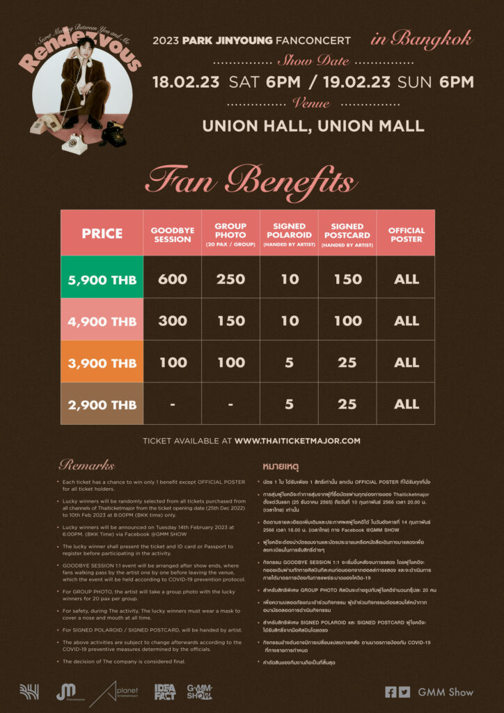 เชื่อว่าเหล่าอากาเซไทย (ชื่อแฟนคลับอย่างเป็นทางการของ GOT7) ต้องถูกใจกับสิ่งนี้ เพราะผู้จัดงานอย่าง ‘IDEA FACT’ (ไอเดียแฟค) หน่วยงานภายใต้ ‘GMM SHOW’ (จีเอ็มเอ็มโชว์) ในเครือ ‘GMM GRAMMY’ (จีเอ็มเอ็มแกรมมี่) เตรียมพาสุภาพบุรุษสุดหล่อ ‘พัค จินยอง’ (PARK JIN YOUNG) วง GOT7 บิดลัดฟ้ามาจัดโซโล่เอเชียทัวร์แฟนคอนเสิร์ตครั้งสำคัญในประเทศไทยกับงาน ‘2023 PARK JIN YOUNG FANCONCERT ‘RENDEZVOUS’ IN BANGKOK: Secret Meeting Between You and Me’ ในวันเสาร์ที่ 18 กุมภาพันธ์ และวันอาทิตย์ที่ 19 กุมภาพันธ์ 2566 เวลา 18.00 น. ณ ยูเนี่ยน ฮอลล์ 2, ชั้น 6 ศูนย์การค้ายูเนี่ยน มอลล์