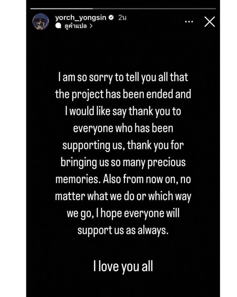 “ผมเสียใจอย่างยิ่งที่จะบอกทุกคนว่า โปรเจกต์ได้สิ้นสุดลงแล้ว และผมอยากขอบคุณทุกคนที่คอยสนับสนุนพวกเรา ขอบคุณที่มอบความทรงจำที่ดีให้กับพวกเรามากมาย หลังจากนี้ไม่ว่าพวกเราจะทำอะไร หรือเลือกเดินไปในทางไหน ผมหวังว่าทุกคนจะยังสนับสนุนพวกเราอยู่เสมอเหมือนเดิมนะครับ รักทุกคนครับ”
