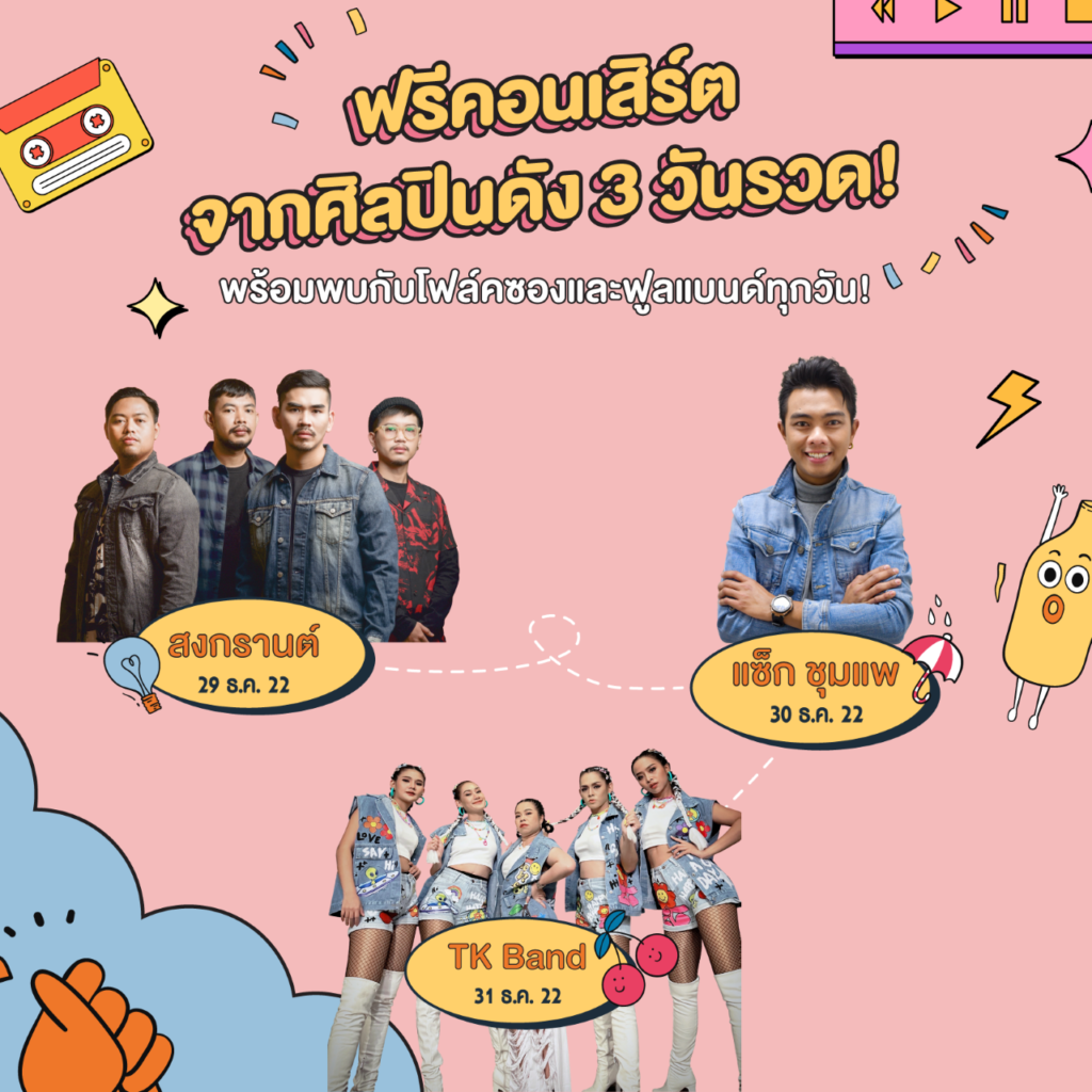 รับชมฟรีคอนเสิร์ตจากศิลปินดังตลอด 3 วัน วันที่ 29 ธันวาคม 2565 พบกับ สงกรานต์ รังสรรค์, วันที่ 30 ธันวาคม 2565 พบกับ แซ็ก ชุมแพ และวันที่ 31 ธันวาคม 2565 คืนเคาท์ดาวที่จัดงานกันไปยาวจนถึงเที่ยงคืน พบกับ วง TK BAND นำโดยคุณตุ๊กกี้ พร้อมกับการเคาท์ดาวน์ต้อนรับปีใหม่ไปด้วยกัน