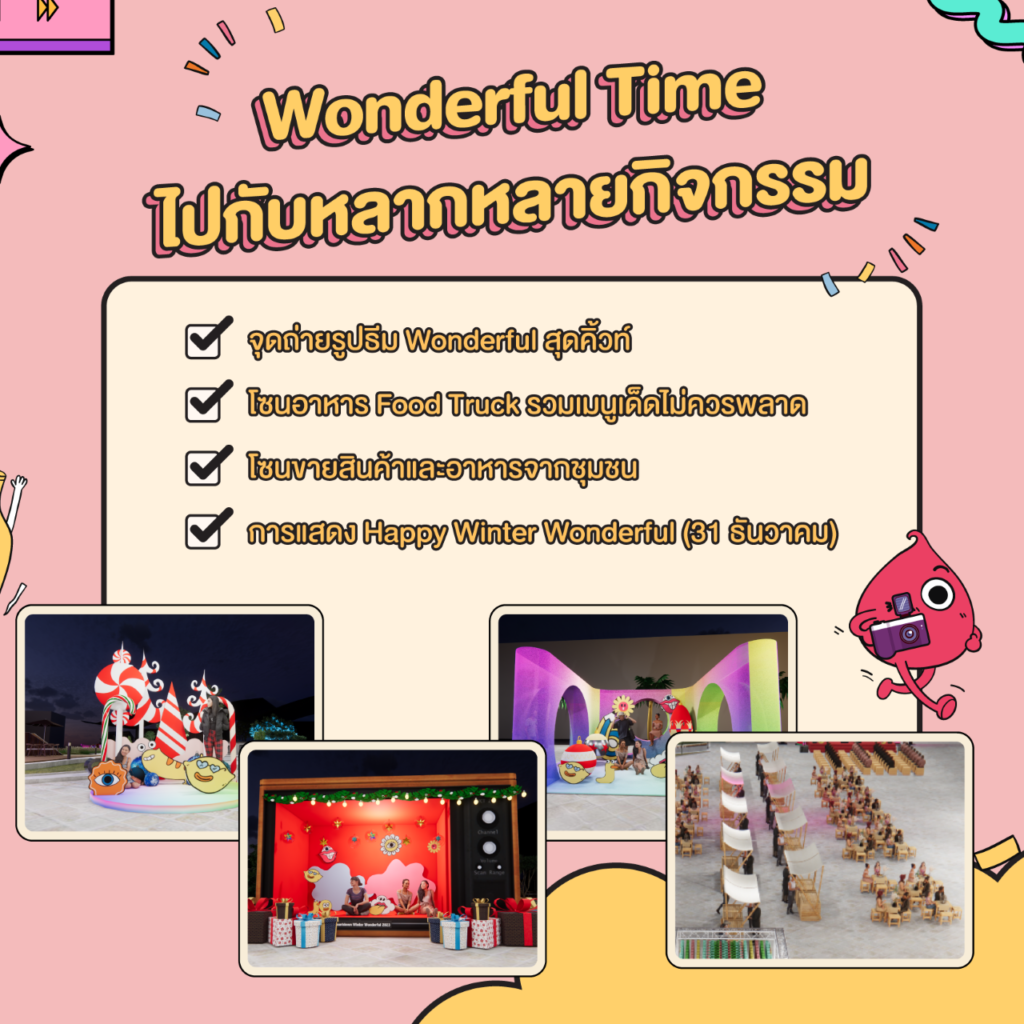 มารับความสุขและความสนุกกันได้ที่นี่ที่เดียว กับงาน “COUNTDOWN WINTER WONDERFUL 2023” ในวันที่ 29-30 ธันวาคม 2565 เวลา 16.00 – 23.00 น. และวันที่ 31 ธันวาคม 2565 เวลา 16.00 – 00.00 น. มาร่วมกันต้อนรับเทศกาลปีใหม่สร้างรอยยิ้มและเสียงหัวเราะส่งท้ายปีเก่าไปด้วยกันในรูปแบบ Winter Wonderful แต่งตัวสนุกสนานคัลเลอร์ฟูลแล้วมาถ่ายรูปกัน บอกเลยห้ามพลาด แถมงานนี้ยังเข้าชมฟรีตลอดงานทั้ง 3 วัน!!!