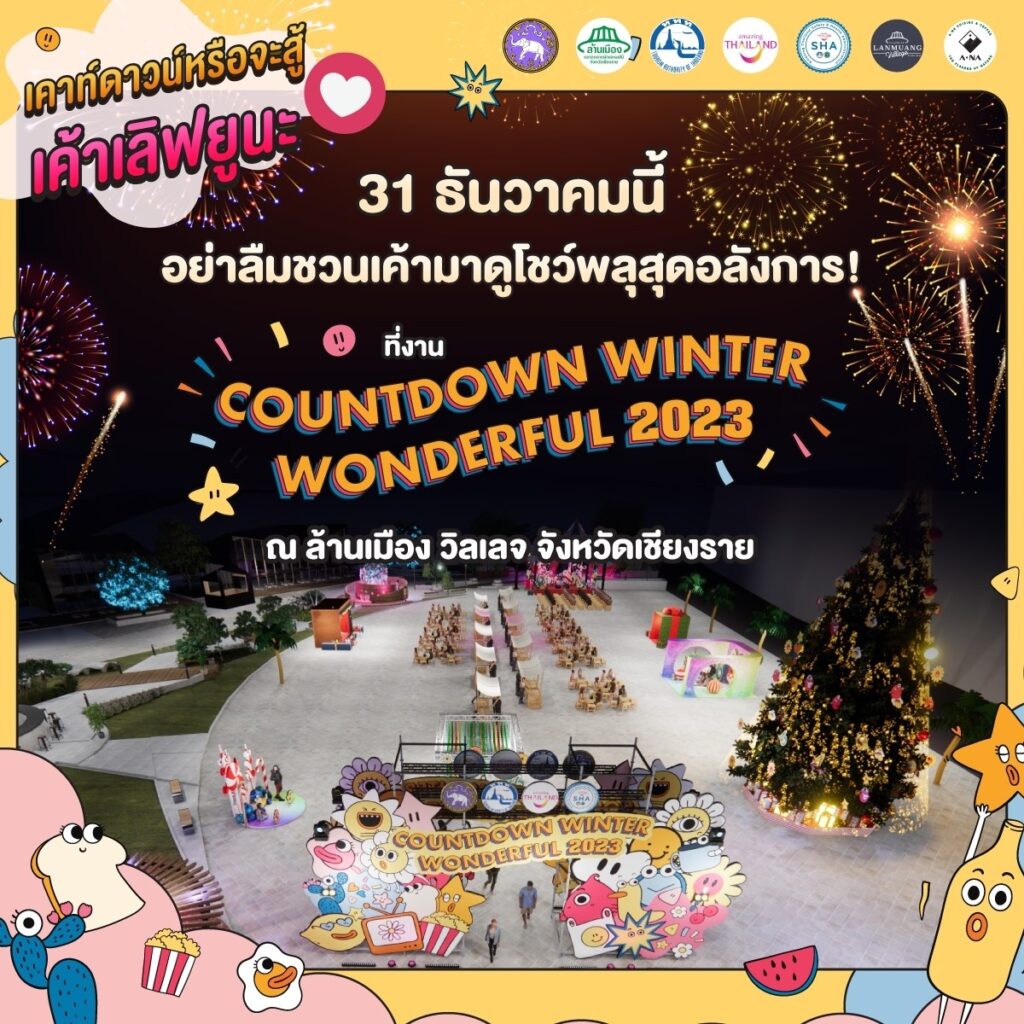 เทศกาลแห่งความสุขกับจังหวัดเชียงราย “COUNTDOWN WINTER WONDERFUL 2023” ในครั้งนี้มากับความสนุก สร้างรอยยิ้ม และเสียงหัวเราะ ที่รอบล้อมปกคลุมไปด้วยความสดใสต้อบรับปี 2023 ระหว่าง วันที่ 29-30 ธันวาคม 2565 เวลา 16.00 – 23.00 น. และวันที่ 31 ธันวาคม 2565 เวลา 16.00 – 00.00 น. ณ ล้านเมือง วิลเลจ จังหวัดเชียงราย เพื่อเป็นการกระตุ้นเศรษฐกิจและการท่องเที่ยวของจังหวัดเชียงราย โดยสามารถสร้างรายได้ให้แก่พื้นที่ชุมชนและพื้นที่ใกล้เคียง และช่วยดึงดูดนักท่องเที่ยวให้เกิดการเดินทางมาท่องเที่ยวในจังหวัดเชียงรายช่วงเทศกาลปีใหม่มายิ่งขึ้น