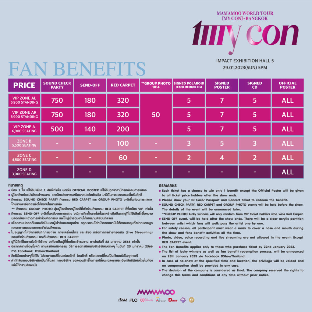 งานนี้ D-SHOW THAILAND และ KOKO CONNECTION ก็ไม่พลาดที่จะพาทั้ง 4 สาวมาเจอกับ MOOMOO (มูมู่ชื่อแฟนคลับ) ชาวไทยกับคอนเสิร์ตเต็มรูปแบบครั้งแรกอัดแน่น กว่า 2 ชั่วโมง ใน MAMAMOO WORLD TOUR [MY CON] – BANGKOK ในวันอาทิตย์ที่ 29 มกราคม 2566 ณ Impact Exhibition Hall 5 โดยเปิดจองบัตรพร้อมกัน ในวันเสาร์ที่ 7 มกราคม 2566 เวลา 10.00 น. ที่ ไทยทิคเก็ตเมเจอร์ ทั้งออนไลน์ bit.ly/3vaBmBF และหน้าเคาน์เตอร์ทุกสาขา Call Center โทร 02-2623456 บัตรราคา VIP 6,900 บาท/ 5,500 บาท / 4,500 บาท และ 3,000 บาท พร้อมสิทธิพิเศษจาก MAMAMOO จัดเต็มให้ MOOMOO ชาวไทยอย่างแน่นอน ติดตามรายละเอียดเพิ่มเติมได้ทาง Facebook และ Twitter @DshowThailand @KOKOConnection เตรียมล้างหูมารอฟังพลังเสียงของสาวๆ กันได้เลย!!