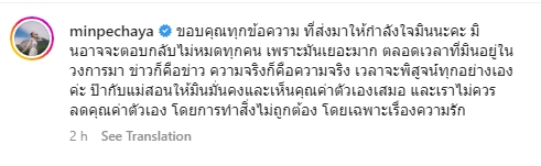 “ขอบคุณทุกข้อความ ที่ส่งมาให้กำลังใจมินนะคะ มินอาจจะตอบกลับไม่หมดทุกคน เพราะมันเยอะมาก ตลอดเวลาที่มินอยู่ในวงการมา ข่าวก็คือข่าว ความจริงก็คือความจริง เวลาจะพิสูจน์ทุกอย่างเองค่ะ ป๊ากับแม่สอนให้มินมั่นคงและเห็นคุณค่าตัวเองเสมอ และเราไม่ควรลดคุณค่าตัวเอง โดยการทำสิ่งไม่ถูกต้อง โดยเฉพาะเรื่องความรัก”