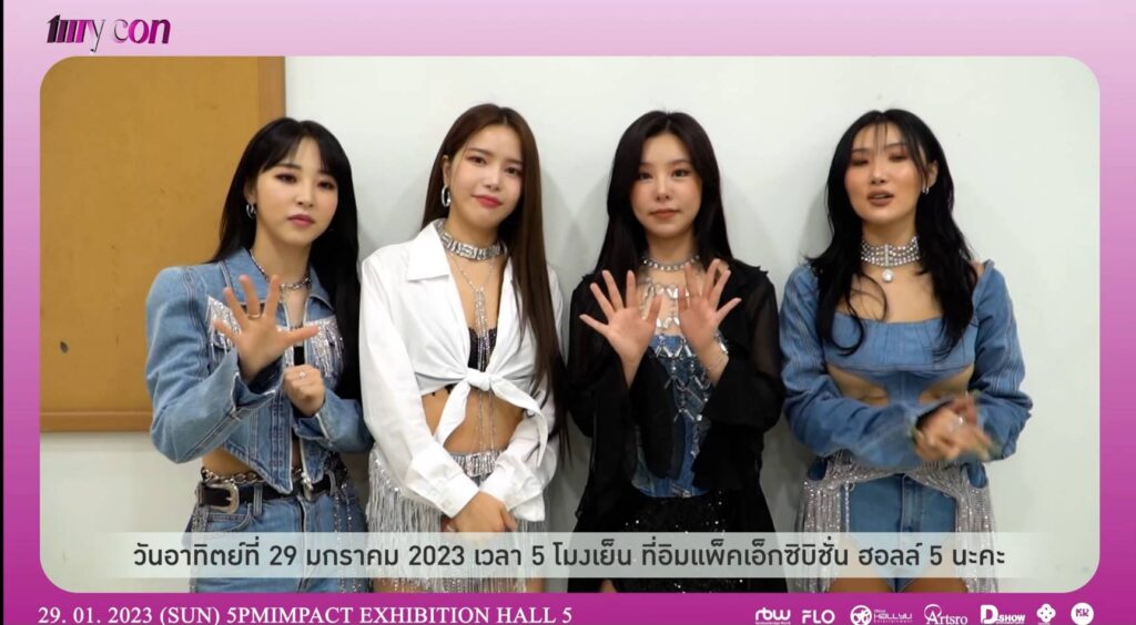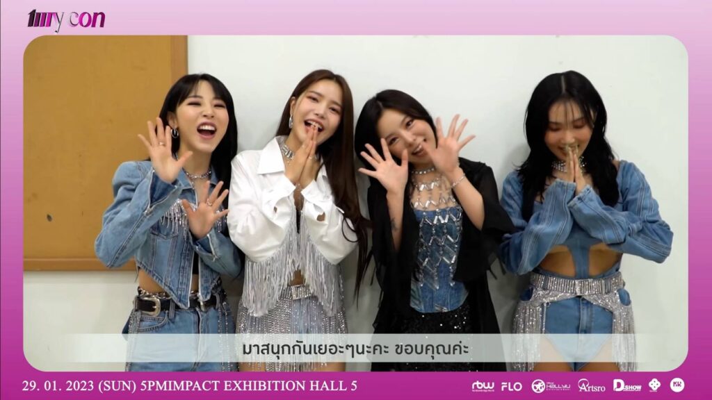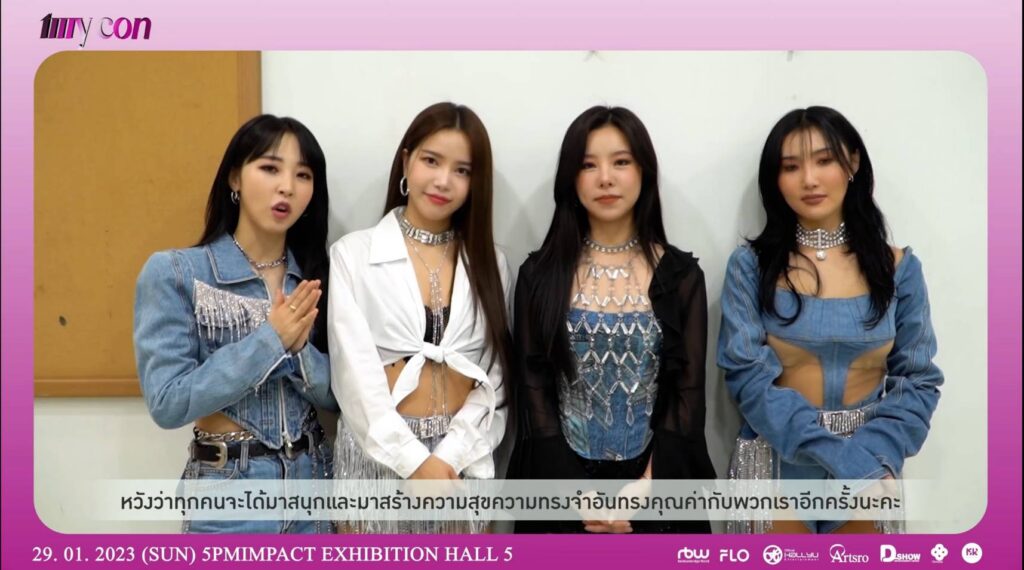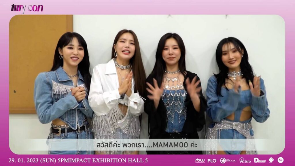 “สวัสดีค่ะ พวกเรา MAMAMOO ค่ะ มูมู่ชาวไทย สบายดีมั้ยคะ ทุกคนคิดถึงพวกเราใช่มั้ยคะ พวกเราเองก็คิดถึงทุกคนมากๆ เช่นกันค่ะ ในที่สุดเราก็จะได้ไปหาทุกคนที่กรุงเทพ ประเทศไทยแล้วนะคะ ดีใจมากๆ เลยค่ะ กับงาน MAMAMOO WORLD TOUR [MY CON] – BANGKOK ในวันอาทิตย์ที่ 29 มกราคม 2023 เวลา 5 โมงเย็นที่อิมแพคเอ็กซิบิชั่น ฮอลล์ 5 นะคะ พวกเราซ้อมหนักกันมากๆ เลย หวังว่าทุกคนจะได้มาสนุก และมาสร้างความทรงจำอันทรงคุณค่ากับพวกเราอีกครั้งนะคะ มาสนุกกันเยอะๆ นะคะ ขอบคุณค่ะ (ภาษาไทย)”