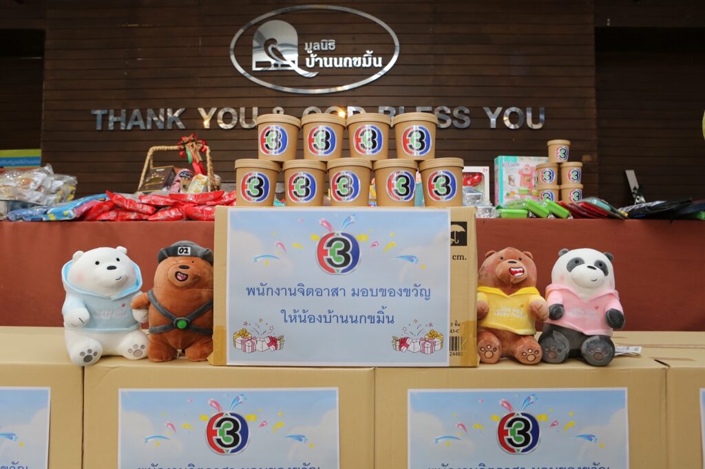 สถานีโทรทัศน์ไทยทีวีสีช่อง 3 นำโดย คุณชาคริต ดิเรกวัฒนชัย รองกรรมการผู้อำนวยการ สำนักกิจการและสื่อสารองค์กร คุณวรวรรณ ติณสูลานนท์ และ คุณสุภิดา ฉัตราภิรักษ์ พร้อมด้วย พนักงานจิตอาสา เข้าร่วมกิจกรรม “ช่อง 3 อาสาทำดี มอบของขวัญ ปันความสุขให้น้องบ้านนกขมิ้น” ส่งมอบของขวัญปีใหม่ และของขวัญวันเด็ก ปี 2566 ให้น้อง ๆ ทั้งหญิงและชาย อายุตั้งแต่ 4-17 ปี ที่อยู่ในความอุปการะของมูลนิธิบ้านนกขมิ้น