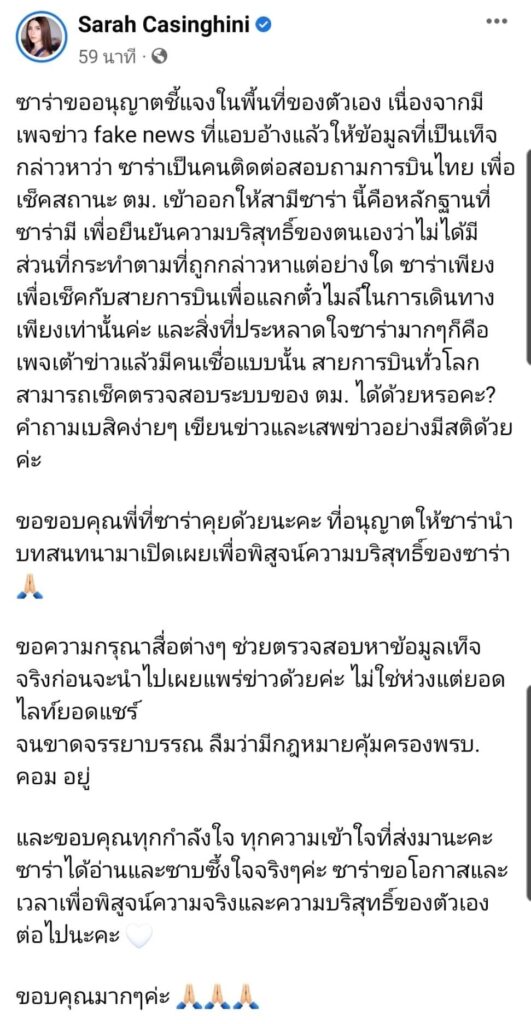 ซาร่าขออนุญาตชี้แจงในพื้นที่ของตัวเอง เนื่องจากมีเพจข่าว fake news ที่แอบอ้างแล้วให้ข้อมูลที่เป็นเท็จกล่าวหาว่าซาร่าเป็นคนติดต่อสอบถามการบินไทย เพื่อเช็คสถานะ ตม. เข้าออกให้สามีซาร่า นี่คือหลักฐานที่ซาร่ามี เพื่อยืนยันความบริสุทธิ์ของตนเองว่าไม่ได้มีส่วนที่กระทำตามที่ถูกกล่าวหาแต่อย่างใด ซาร่าเพียงเพื่อเช็คกับสายการบินเพื่อแลกตั๋วไมล์ในการเดินทางเพียงเท่านั้นค่ะ และสิ่งที่ประหลาดใจซาร่ามากๆก็คือเพจเต้าข่าวแล้วมีคนเชื่อแบบนั้น สายการบินทั่วโลกสามารถเช็คตรวจสอบระบบของ ตม. ได้ด้วยหรอคะ? คำถามเบสิคง่ายๆ เขียนข่าวและเสพข่าวอย่างมีสติด้วยค่ะ