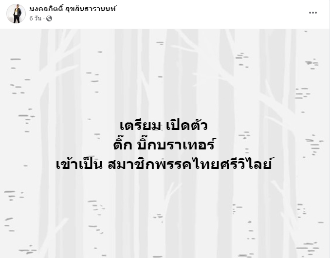 ทำเอาวงการการเมืองฮือฮาไม่น้อย จากกรณี “ส.ส. เต้ มงคลกิตตฺ สุขสินธารานนท์” ได้เคลื่อนไหวผ่านทางเฟซบุ๊กพร้อมโพสต์ภาพข้อความ“เตรียมเปิดตัว ติ๊ก บิ๊กบราเทอร์ เข้าเป็น สมาชิกพรรคไทยศรีวิไลย์”