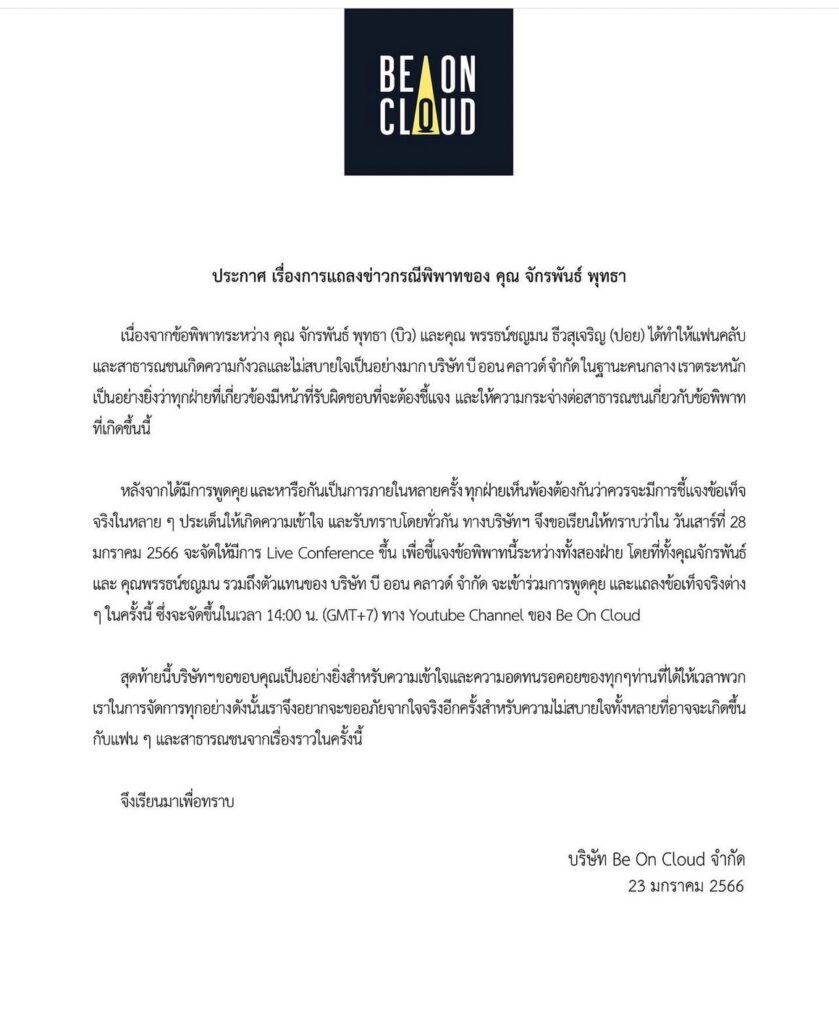 หลังจากได้มีการพูดคุย และหารือกันภายในหลายครั้ง ทุกฝ่ายเห็นพ้องต้องกันว่าจะมีการชี้แจงข้อเท็จจริงในหลายๆ ประเด็น ให้เกิดความเข้าใจและรับทราบโดยทั่วกัน จึงจะมีการจัด ไลฟ์ คอนเฟอเรนซ์ เพื่อชี้แจงข้อพิพาทนี้ระหว่างสองฝ่าย ในวันเสาร์ที่ 28 มกราคม เวลา 14.00 น. โดยมี บิว จักรพันธ์ และ ปอย เข้าร่วมรวมถึงตัวแทนของต้นสังกัด ผ่านทางช่องทางยูทูปของBe On Cloud