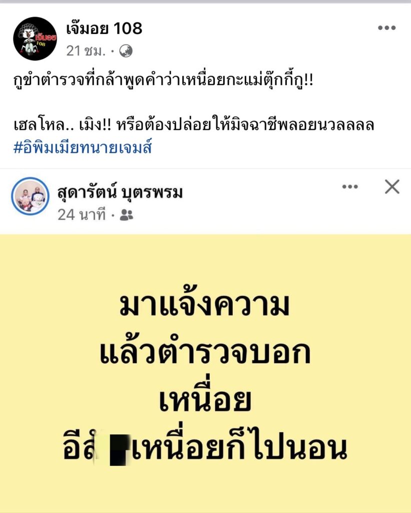 โดย “ตุ๊กกี้” ได้โพสต์ข่อความ ผ่านทางเฟซบุ๊กส่วนตัวว่า “มาแจ้งความ แล้วตำรวจบอก เหนื่อย อีสัX เหนื่อยก็ไปนอน”
