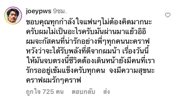 นอกจากนี้หนุ่มโจอี้ ยังโพสต์ข้อความขอบคุณแฟนๆที่เข้ามาให้กำลังใจอย่างล้นหลามว่า “ขอบคุณทุกกำลังใจแฟนๆไม่ต้องคิดมากนะครับผมไม่เป็นอะไรครับมันผ่านมาแย้วอิอิ ผมจะกัสคนที่น่ารักอย่างพี่ๆทุกคนนะคราฟ หวังว่าจะได้รับพลังที่ดีจากผมน้า เรื่องวันนี้ให้มันจบตรงนี้ชีวิตต้องเดินหน้ายังมีคนที่เรารักรออยู่เข้มแข็งครับทุกคน จงมีความสุขนะครับ ผมรักๆครับ”