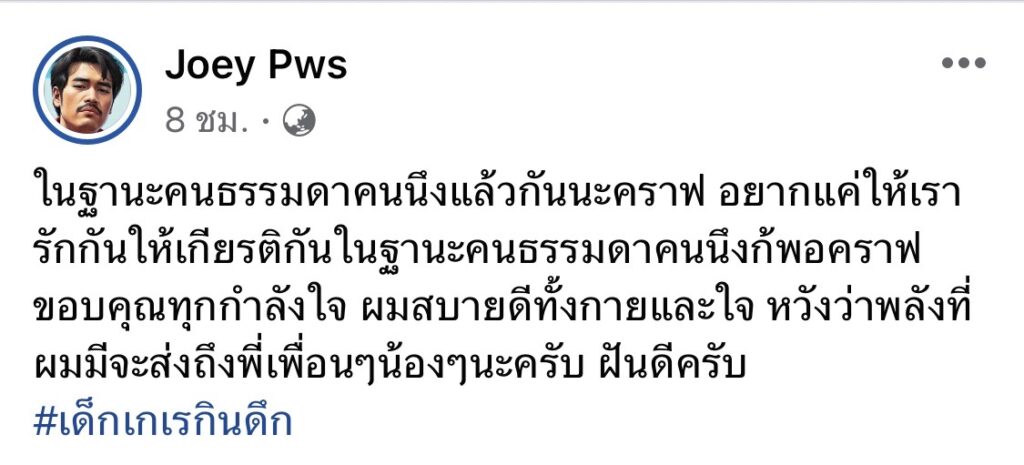ล่าสุด โจอี้ ก็ได้ออกมาเคลื่อนไหวเป็นครั้งแรก! โดยเจ้าตัวได้โพสต์ข้อความผ่านทางเฟซบุ๊กว่า “ในฐานะคนธรรมดาคนนึงแล้วกันนะคราฟ อยากแค่ให้เรารักกันให้เกียรติกันในฐานะคนธรรมดาคนนึงก็พอคราฟขอบคุณทุกกำลังใจ ผมสบายดีทั้งกายและใจ หวังว่าพลังที่ผมมีจะส่งถึงพี่เพื่อนๆน้องๆ นะครับ ฝันดีครับ #เด็กเกเรกินดึก”